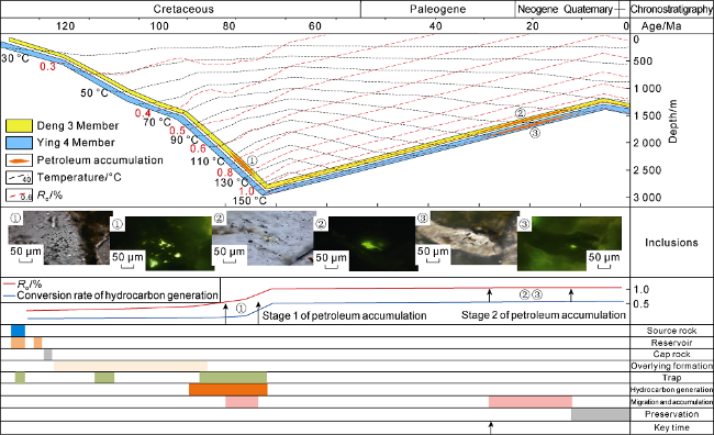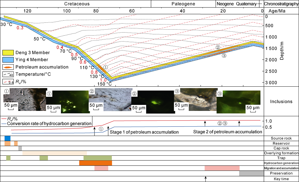 Fig. 9. Source rocks evolution, petroleum accumulation and petroleum system events in Shuangcheng area. |
