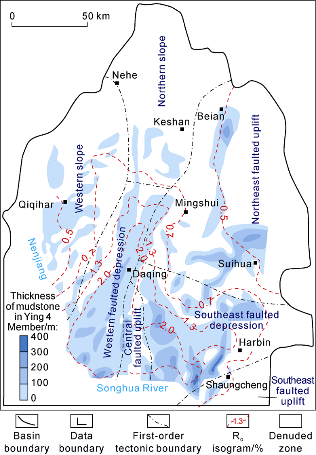 Fig. 11. Distribution of mudstone thickness and thermal evolution of the Ying 4 Member in Songbei. |