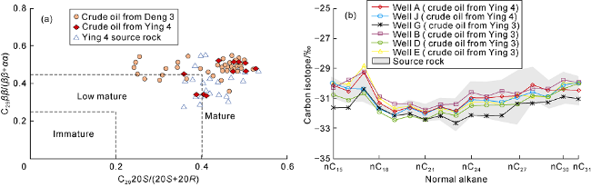 Fig. 4. Geochemical characteristics of Yingcheng Formation source rock and crude oil from Yingcheng-Denglouku formations. (a) Crossplot of C2920S/(20S+20R) and C29ββ/(αα+ββ); (b) Carbon isotopic composition distribution and normal alkane of source rock and crude oil [20]. |