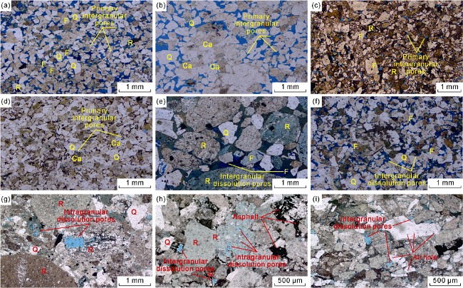 Fig. 7. Pore characteristics in the reservoirs in Shuangcheng area. (a) Primary intergranular pores, lithic feldspar sandstone, Denglouku Formation, Well D, 1153.98 m; (b) Primary intergranular pores, feldspar sandstone, Denglouku Formation, Well D, 1172.87 m; (c) Primary intergranular pores, anisometric sandstone, Denglouku Formation, Well D, 1149.84 m; (d) Primary intergranular pores, calcareous feldspar sandstone, Denglouku Formation, Well D, 1173.55 m; (e) Intergranular volcanic dissolved pores, tuffaceous sandstone, Denglouku Formation, Well D, 1193.91 m; (f) Intergranular feldspar dissolution pores, feldspar sandstone, Denglouku Formation, Well D, 1168.53 m; (g) Intragranular dissolved pores, sandy conglomerate, Ying 4 Member, Well K, 1501.42 m; (h) Intragranular and intergranular dissolution pores, sandy conglomerate, Ying 4 Member, Well K, 1436.74 m; (i) Intergranular dissolution pores, sandy conglomerate, Ying 4 Member, Well K, 1449.76 m. Q—quartz; F—feldspar; R—rock debris; Ca—calcium. |