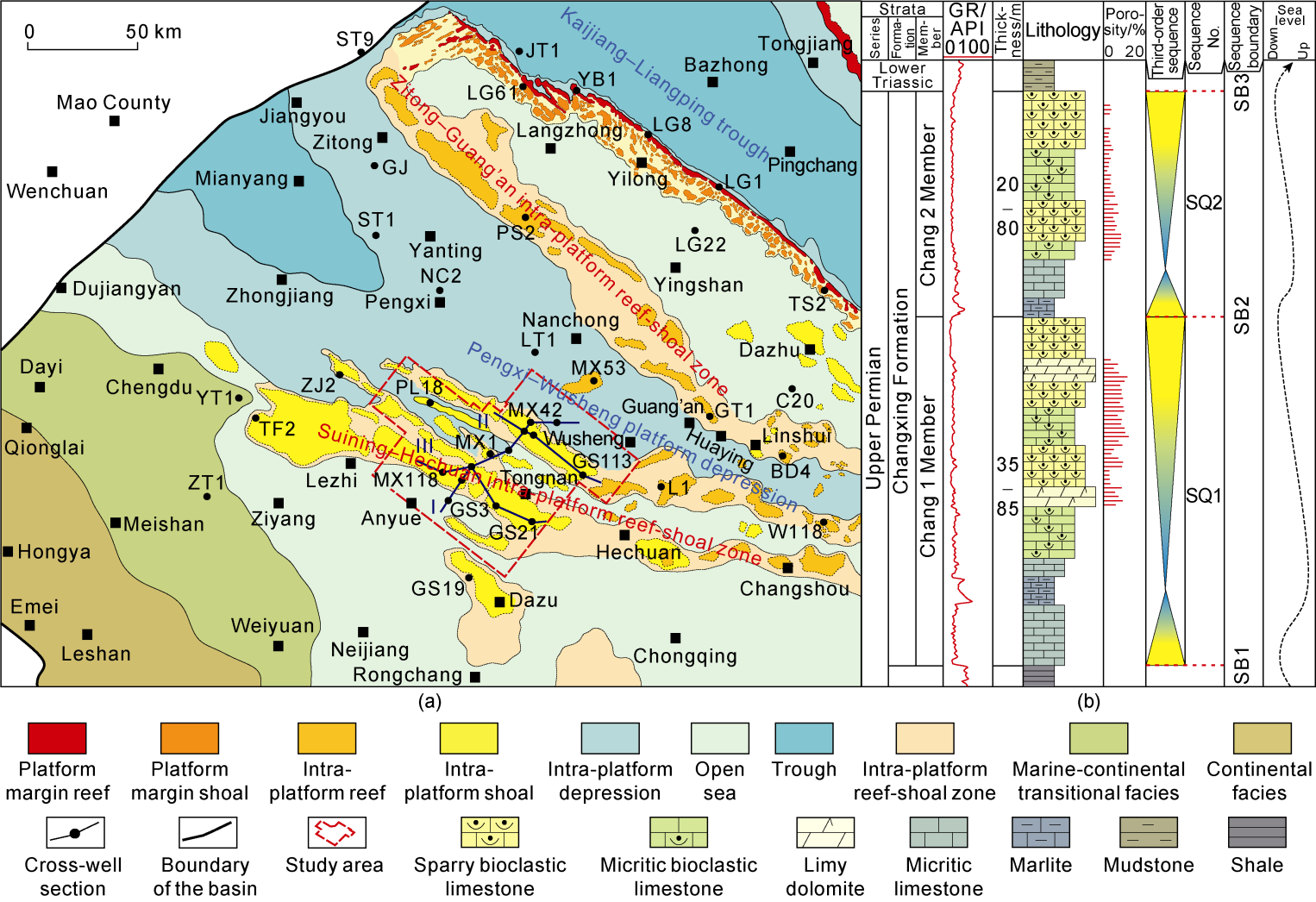 [1⇓⇓-4]. The Permian Changxing Formation reef shoal in the Sichuan Basin has been one of the hotspots of oil and gas exploration for marine carbonate reservoirs due to its wide sedimentary range, large thickness and multiple stages of deposition