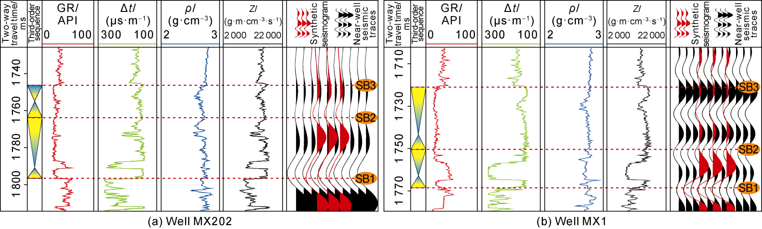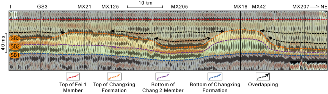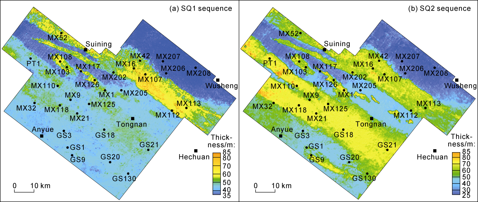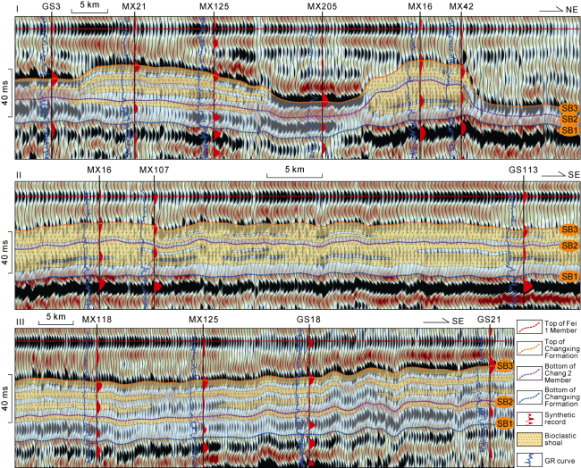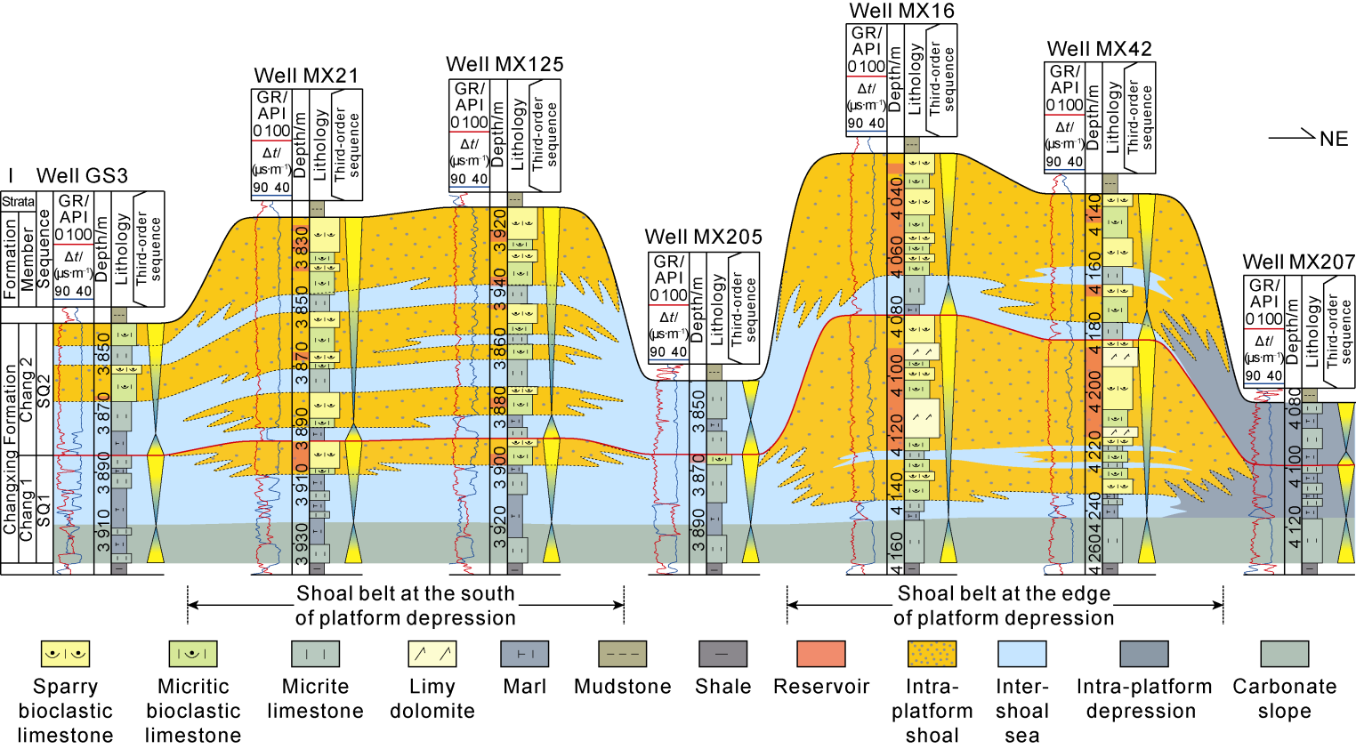 [19-20]. At present, there have been relatively few studies on the spatiotemporal distribution characteristics of bioclastic shoals in the platform of the Changxing Formation in the central Sichuan Basin. However, it is the main factor which determines the distribution of reservoirs in the region and controls the formation of natural gas reservoirs. Using core, logging, seismic and regional background data, and on the basis of third-order sequence boundary identification, this paper establishes an isochronous well-seismic sequence correlation framework, defines the typical sedimentary architecture of the intra-platform shoal under the constraint of the sequence framework, analyzes the vertical and horizontal development and distribution of the intra-platform shoal, and establishes the sedimentary evolution model of the shoal. It is expected that these works are useful to improve the efficiency of natural gas exploration in the Changxing Formation, promote the process of regional exploration and development in the central Sichuan Basin, and provide a reference for natural gas exploration in the intra-platform area of Sichuan Basin in the future.