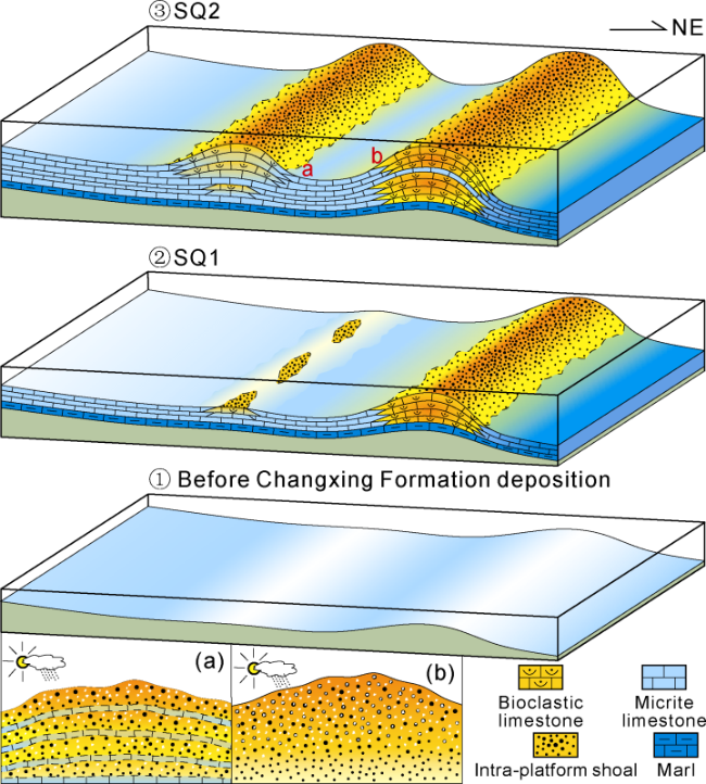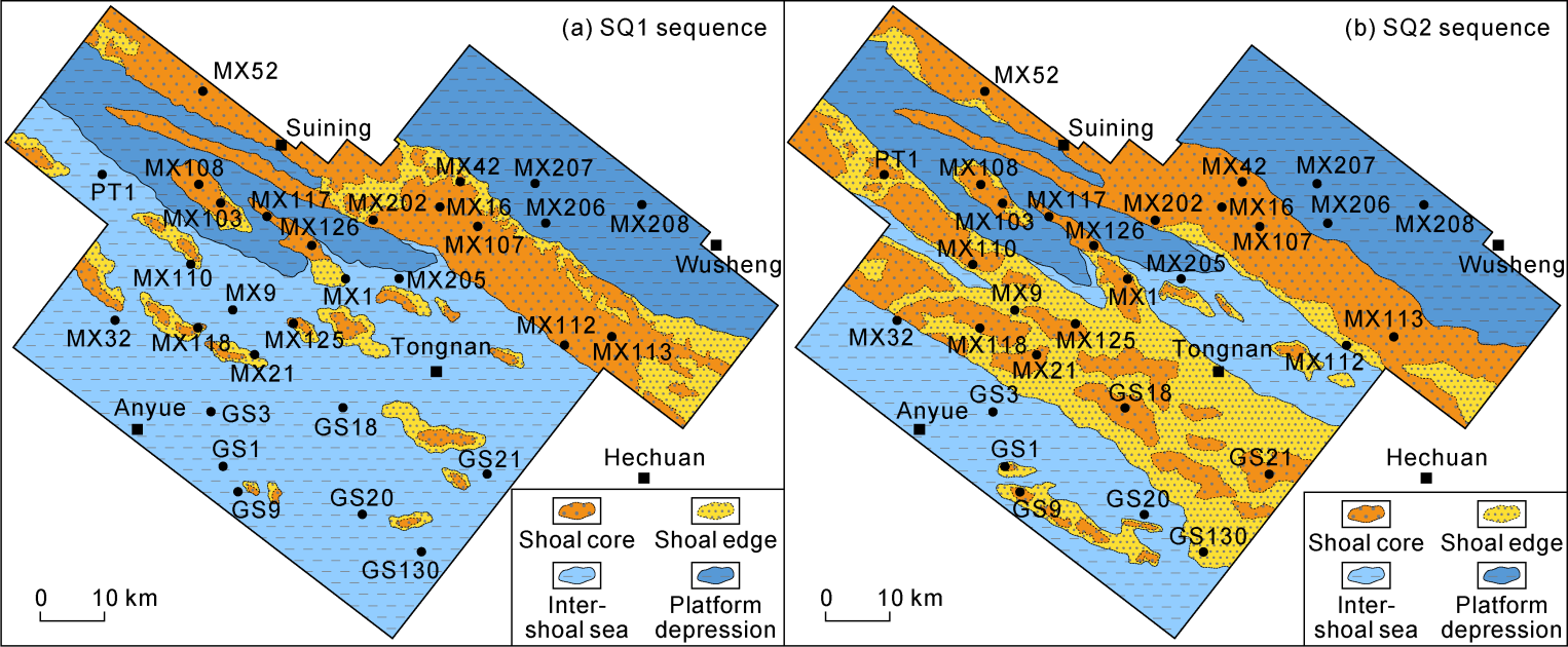 [12]. Subsequently, platform reef gas reservoirs such as Bandong, Shuanglong, Wolonghe and Zhangjiachang in the eastern Sichuan Basin were discovered, and wells such as MX1 and WJ1 in the central Sichuan Basin have been successively put into industrial production. Then the intra-platform reef-shoal reservoir in the Changxing Formation has thus become an important exploration target