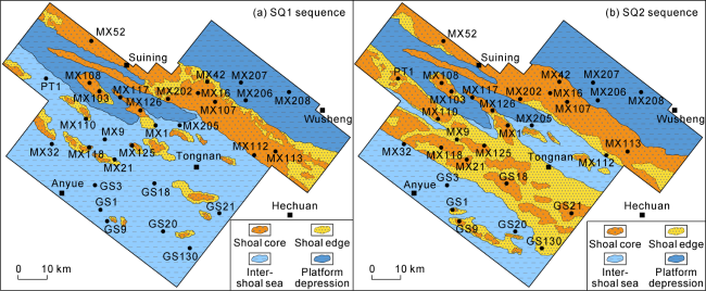 [18]. Compared with the narrow, long and stable platform margin zone, the plane distribution of the reef-shoals is unstable although the area within the platform is vast, showing complex stacking law vertically. Besides, the reservoirs demonstrate strong heterogeneity longitudinally and horizontally, resulting in many difficulties in the prediction of the distribution of gas reservoirs within the platform
