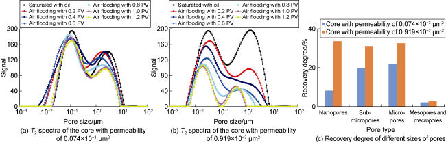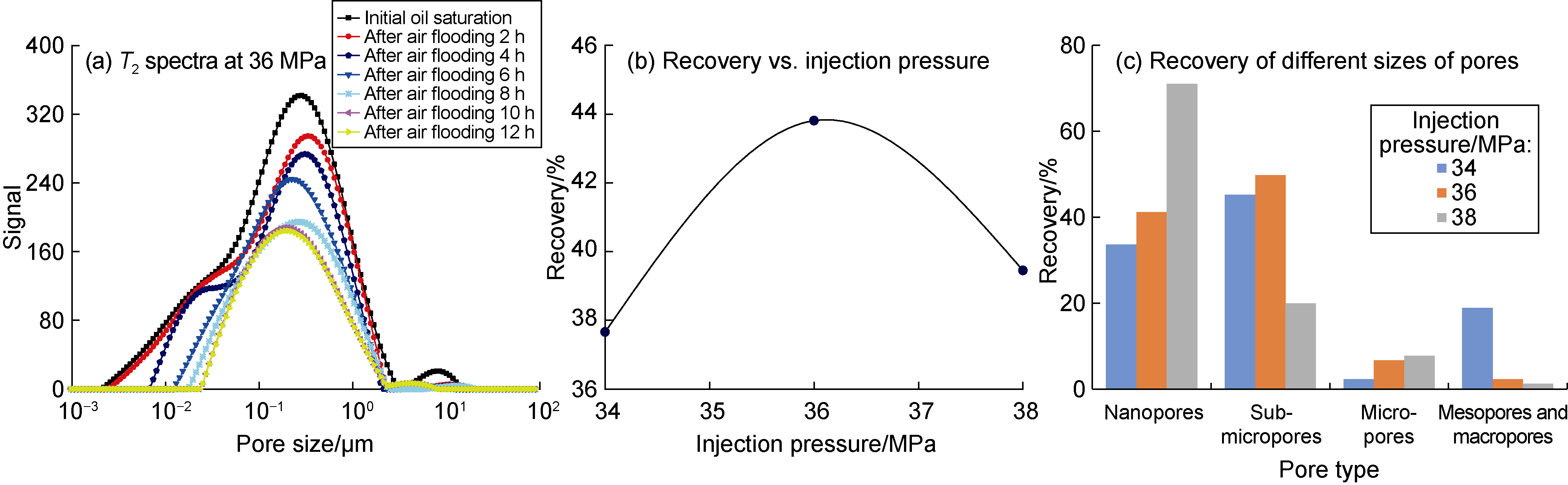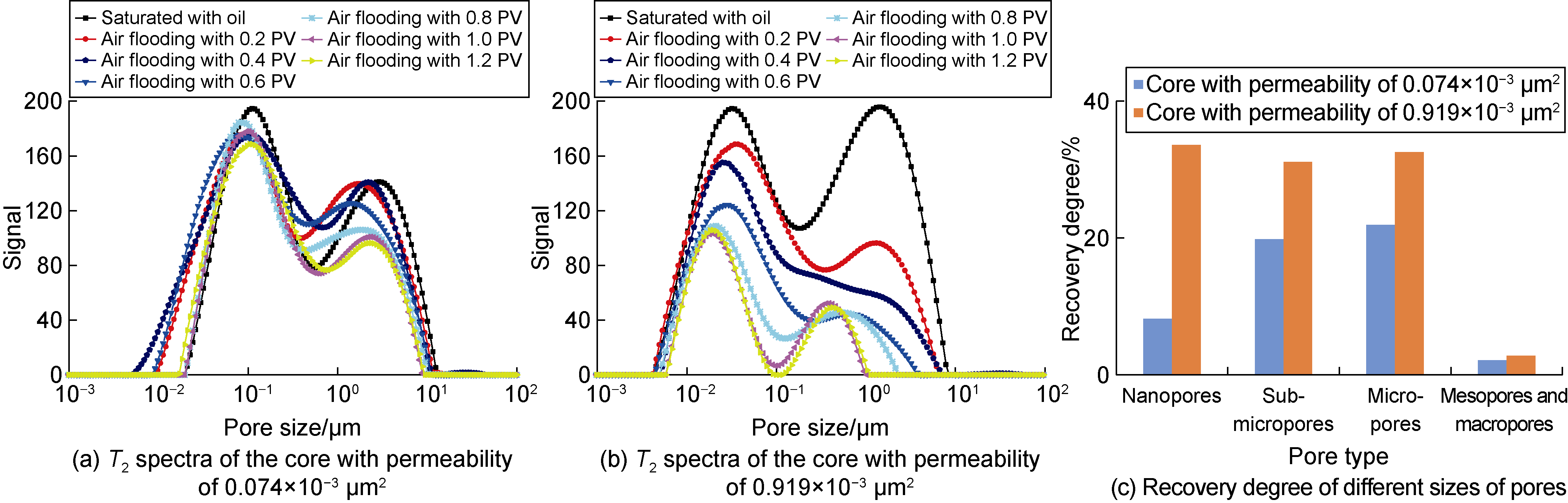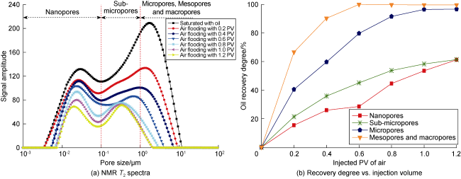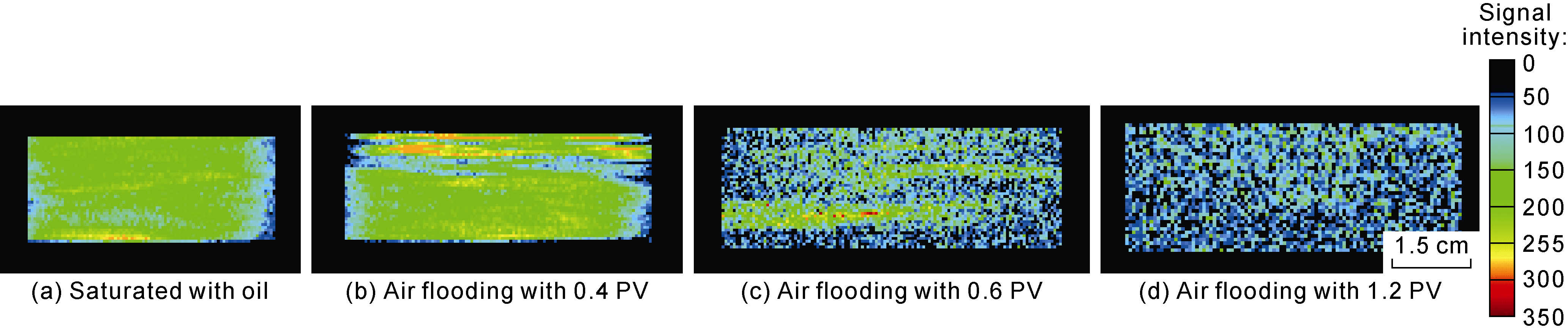 2 etc. can play a role similar to flue gas flooding. The flue gas continuously extracts the low-carbon components in the crude oil, which makes the injected gas continuously enriched and close to the properties of the oil. Meanwhile, the crude oil produces a slow component mass transfer under the action of extraction, and gradually depletes and closes to the properties of the injected gas. As a result, the interfacial tension of oil and gas decreases, and the injected gas, light and medium hydrocarbon gas, and crude oil act as nearly miscible or partially thermal miscible flooding under high temperature and high pressure. Therefore, under various oil recovery mechanisms, during air flooding, LTO reaction induces a high-temperature displacement front which is similar to the bulldozing effect proposed by Gutierrez et al.