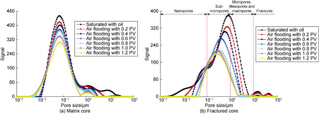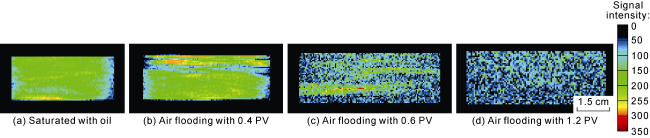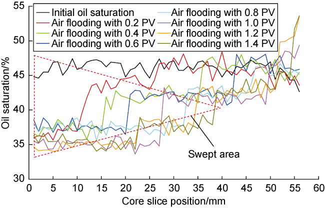 Based on the differences in air flooding sweeping mode and production characteristics of shale oil, the core can be divided into reaction trailing edge area, reaction front edge area, and unswept area. Among them, the reaction front edge area can be driven by pressure difference and dissolution. The main flooding mechanism of differential pressure is that high-pressure air enters the matrix pore throats under pressure and displaces the crude oil by differential pressure. The main oil displacement mechanism of dissolution is LTO reaction between oxygen in the air injected and crude oil. The CO, CO