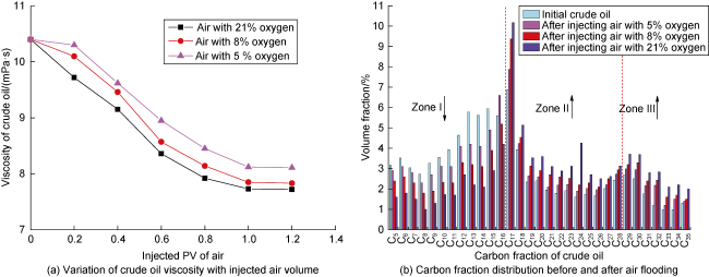 2, ether, aldehyde and ketone produced by the reaction can expand the volume of crude oil, reduce the viscosity and enhance the fluidity. Meanwhile, the mass exchange between oil and gas makes the reaction products further dissolve into the crude oil, which can effectively supplement the formation energy. With the decrease of depletion pressure, the gas dissolved in the crude oil separates and forms dissolved gas flooding. Moreover, the light components evaporated from the oil, together with the CO and CO