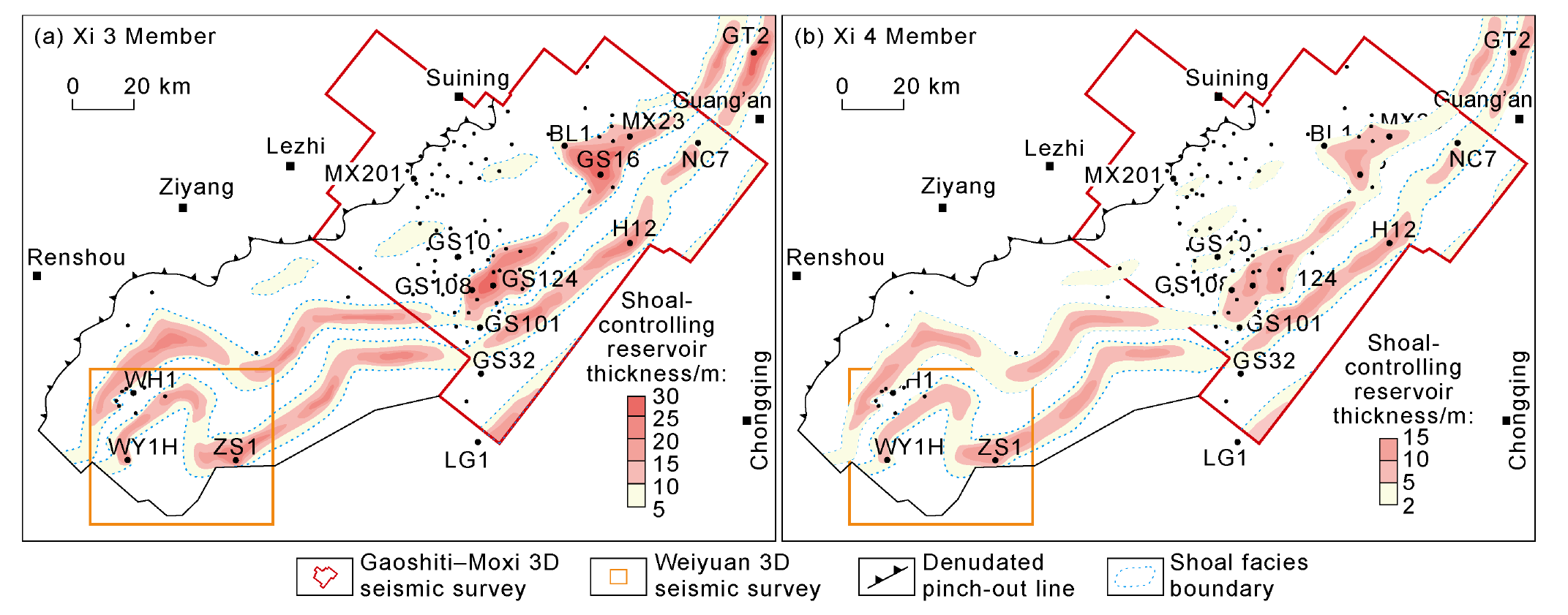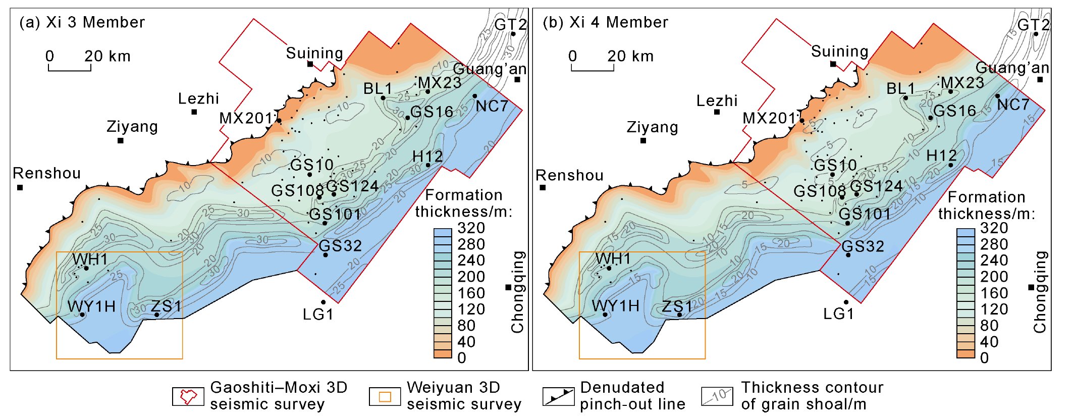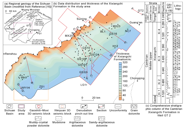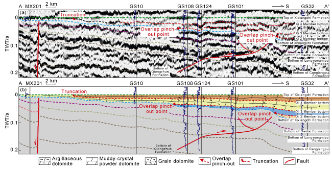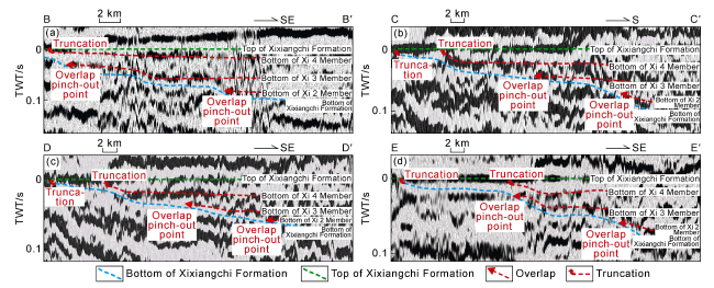 Fig. 15b). Accordingly, turbidites, argillaceous carbonates in the transition zone, and shallow-water carbonate rocks on the Yangtze platform were successively filled from the Cathysia Block to the Yangtze Block. Therefore, the uplift and depression pattern of the central Sichuan area was more influenced by the extrusion from the west margin of the Yangtze Block, and it’s closely related to the foreland basin formed by the India-Himalaya block thrusting toward the Yangtze Block. From west to east, the intracratonic Aba Depression (foredeep), the central Sichuan paleo-uplift (forebulge) and the eastern backbulge basin were developed successively. The westward small thrust fault terminating at the bottom of the Xixiangchi Formation is a direct response to the foreland extrusion thrust system on the seismic section (
