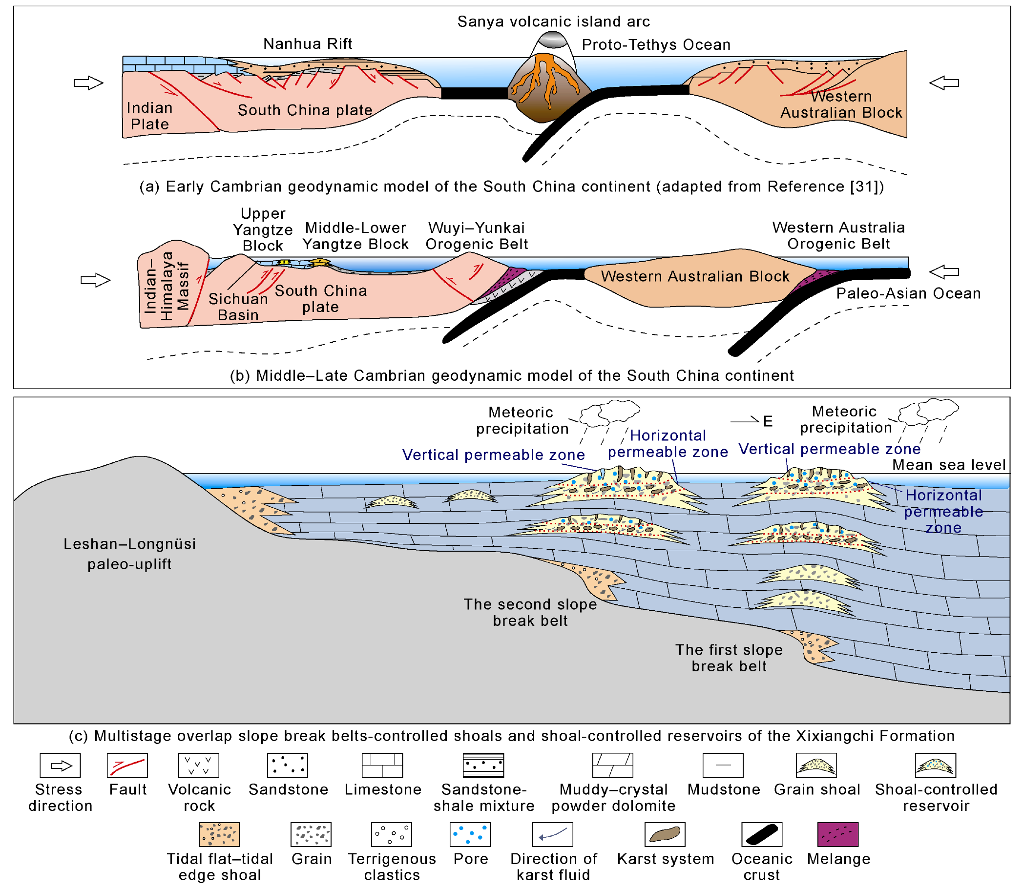 [27]. In the late Early Cambrian, the proto-Tethys oceanic crust subducted along the Sanya Island arc, while the eastern part of the South China Plate was still a passive continental margin