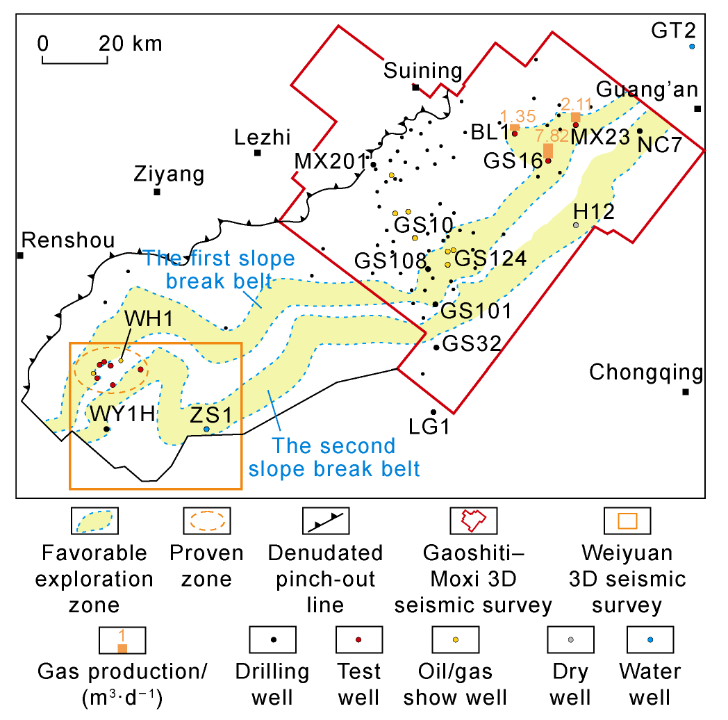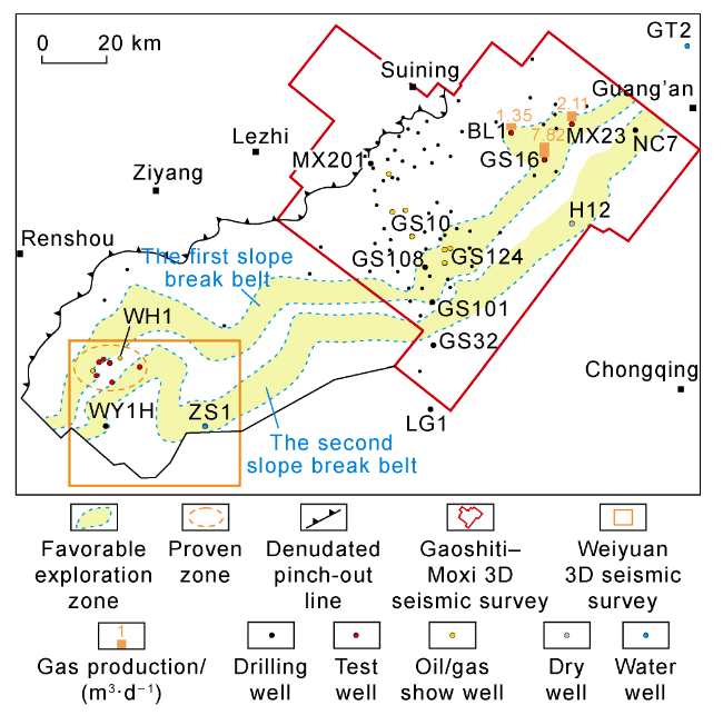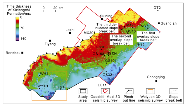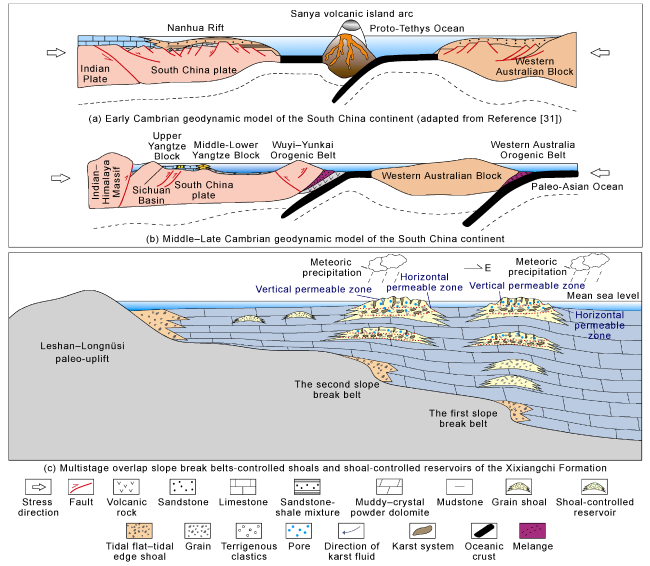 Fig. 2), reflecting forward thrust extrusion from west to east in the Middle-Late Cambrian. The tectonic transfer process directly resulted in the dramatic change of geomorphology and the formation of slope break belts, and then controlled the paleo-geomorphology of the southern slope of the Leshan-Longnüsi paleo- uplift as multiple slope breaks toward southeast (