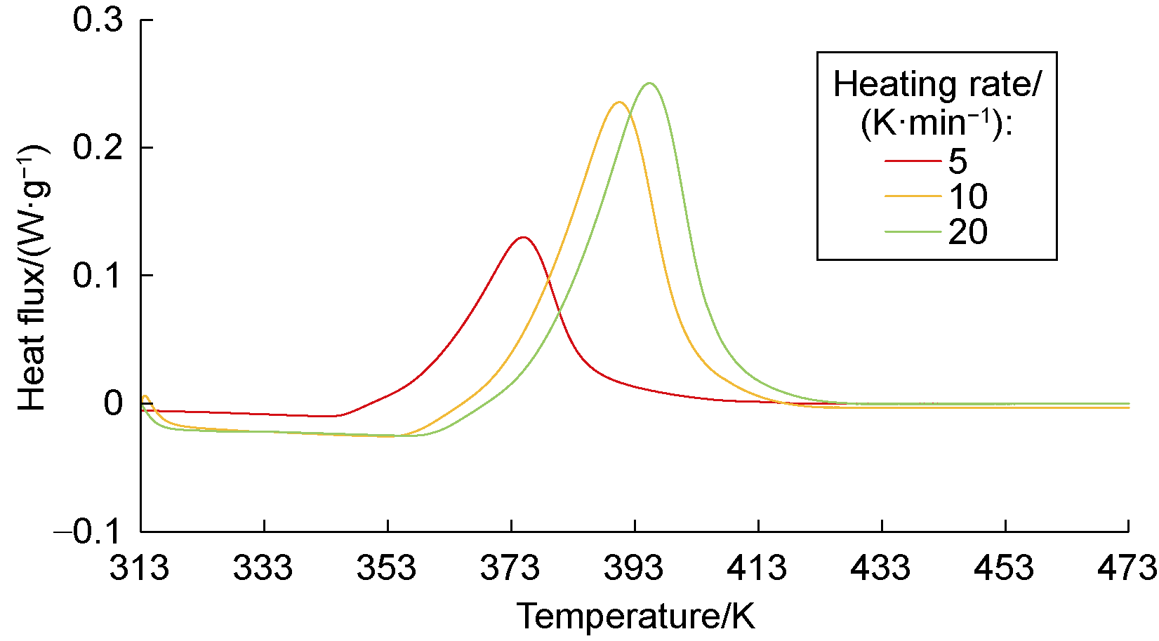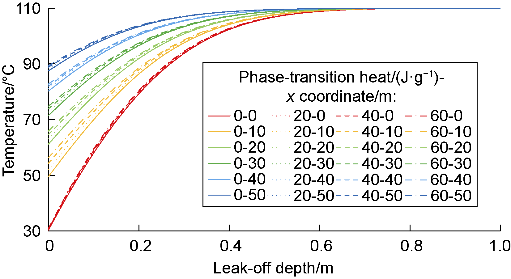 Table 1). The phase-transition heat values measured under heating rates of 5, 10, and 20 K/min are 32.07, 31.40, and 32.10 J/g, respectively, with an average value of 31.86 J/g. To analyze the influence of phase-transition heat on the fracture temperature field, the temperature distributions under phase-transition heat values of 0, 20, 40, and 60 J/g were calculated (