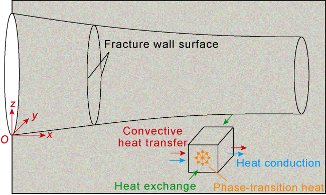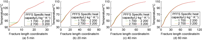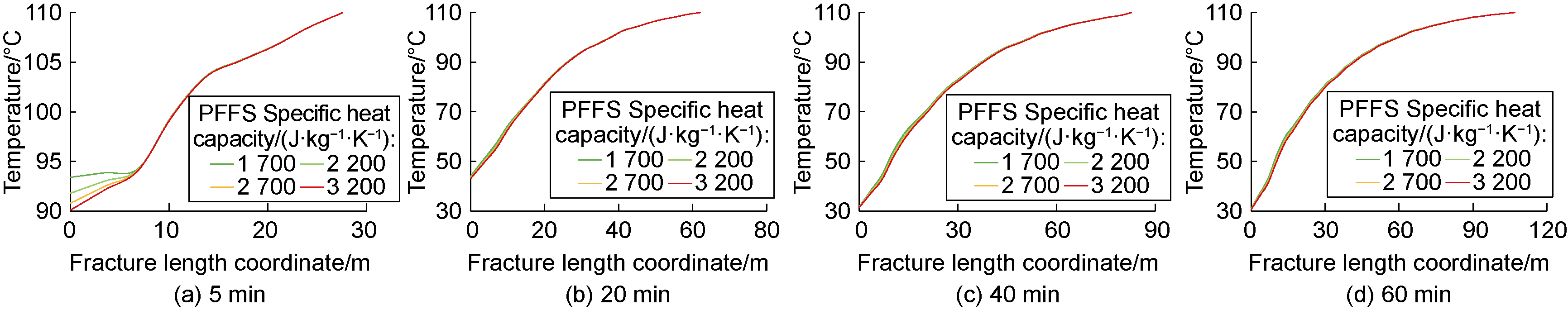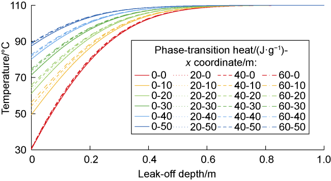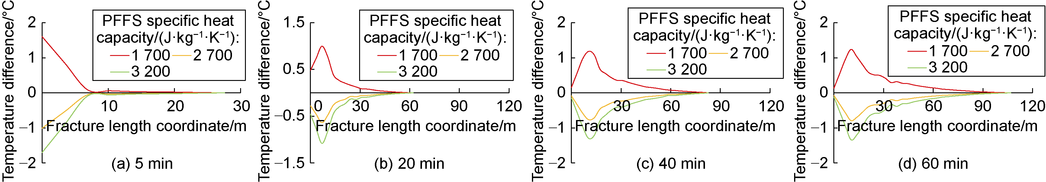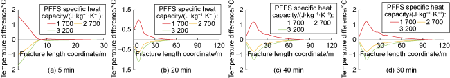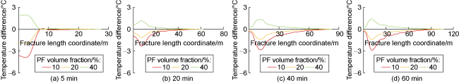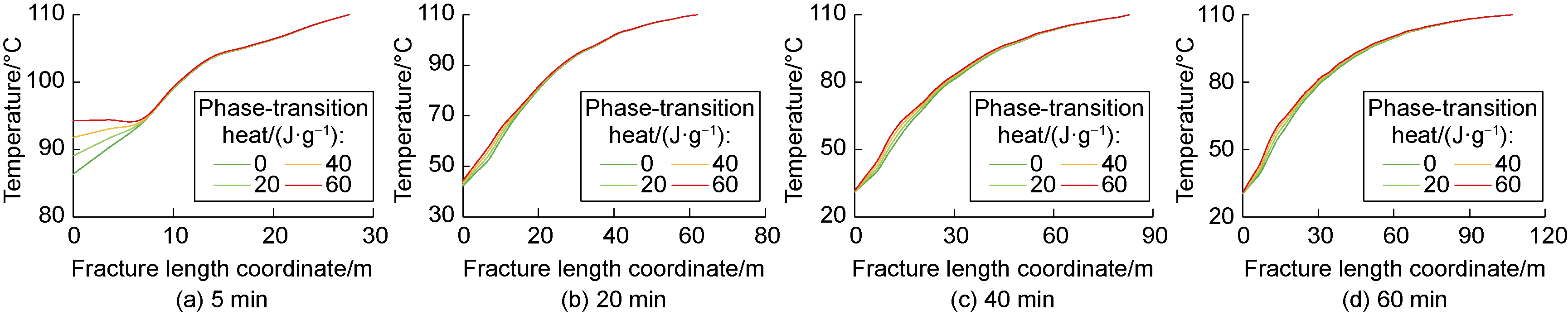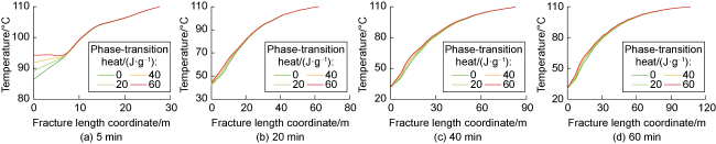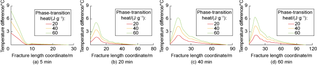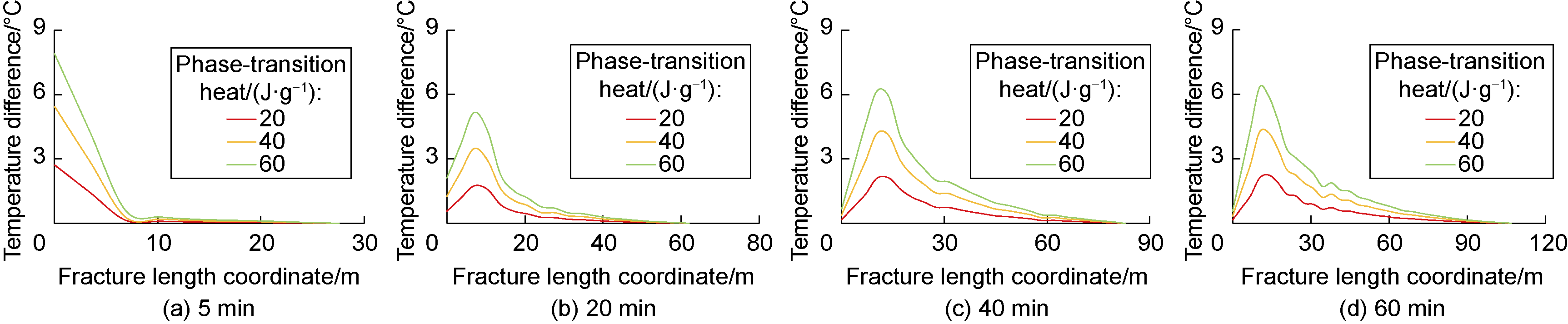 Fig. 7). The results indicate that the larger the phase-transition heat, the higher the relative temperature within the fracture. Furthermore, the temperature difference near the fracture mouth is significant under different phase- transition heat conditions, while the temperature difference decreases as the distance to the fracture tip increases. At injection times of 5, 20, 40, and 60 min, the maximum temperature difference occurs at approximately 0, 7, 10, and 10 m from the fracture mouth along the central axis under different phase-transition heat conditions. This phenomenon can be attributed to the following reasons: (1) At an injection time of 5 minutes, the overall temperature within the fracture is relatively high. PF undergoes substantial phase transition near the fracture mouth, and the resulting phase-transition heat significantly raises the temperature at the mouth (