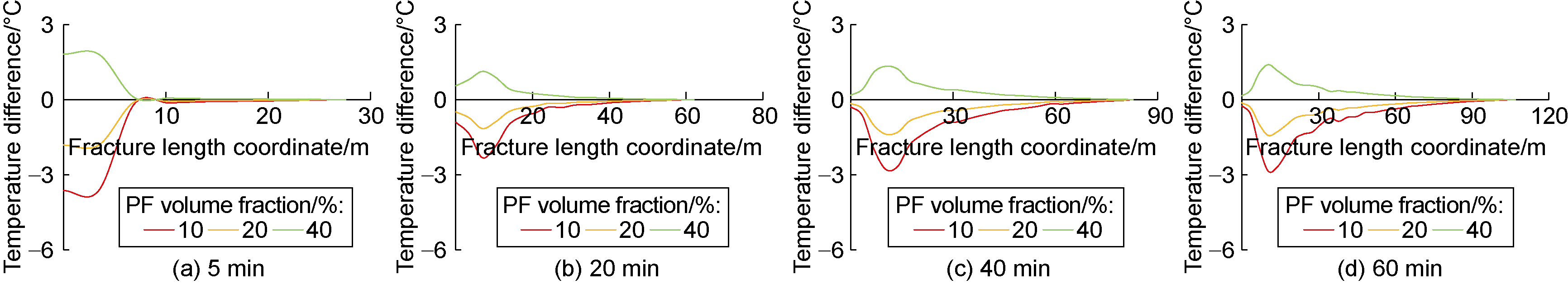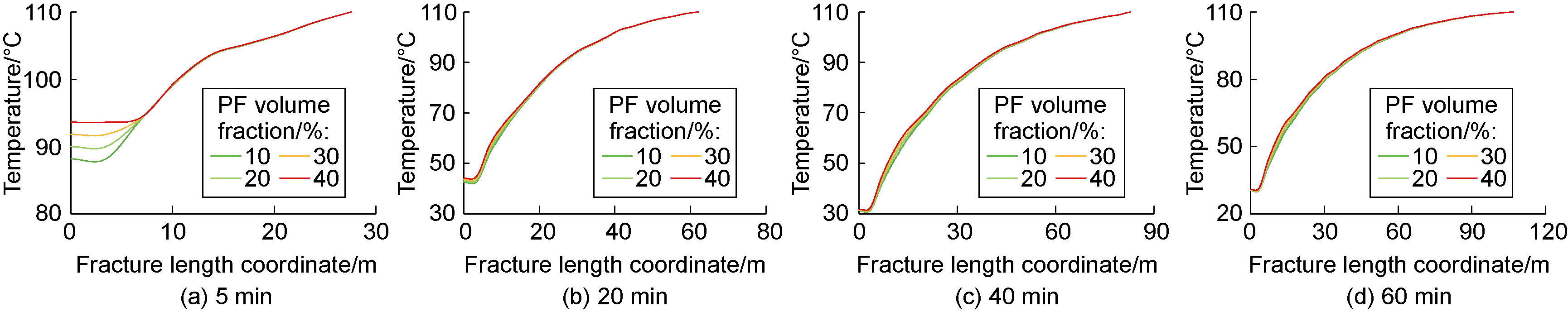 [17]. (3) At injection times of 40 and 60 min, the temperature differences within the fracture under different phase-transition heat conditions are minimal. The temperature at the fracture mouth remains low, with limited PF undergoing phase transition, resulting in a small temperature rise. At approximately 10 m within the fracture, the temperature rises sufficiently to trigger substantial PF phase transition. Beyond 10 m, the remaining PF and phase-transition volume are minimal, reducing the temperature variation caused by phase-transition heat (