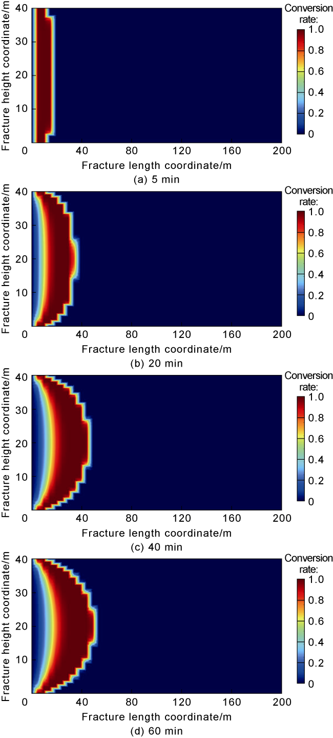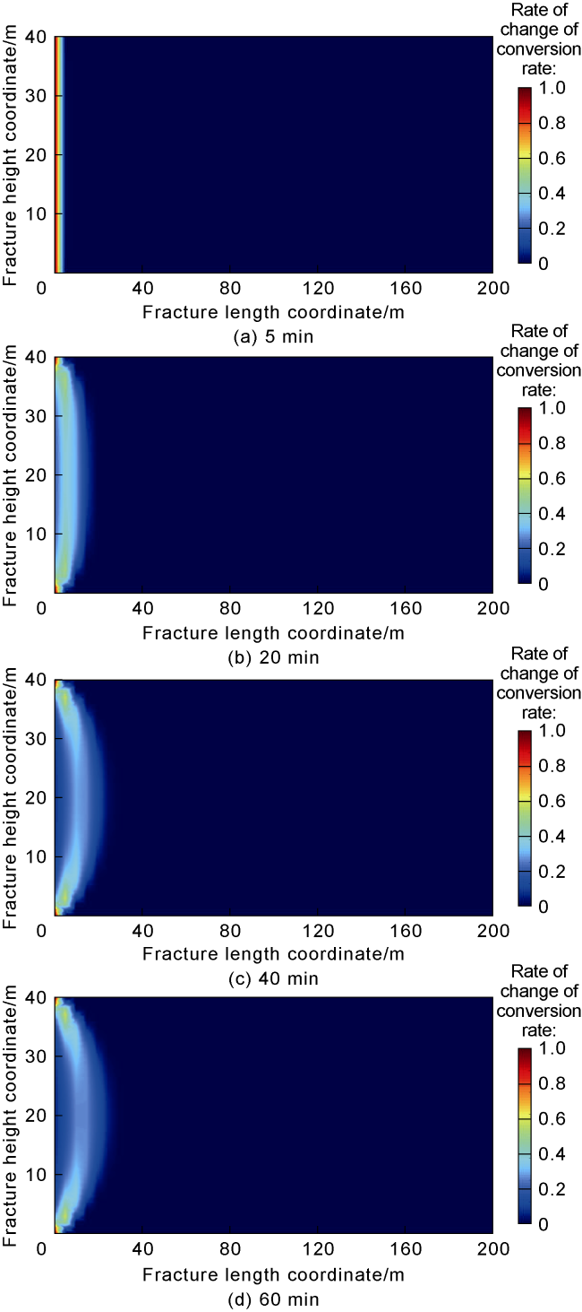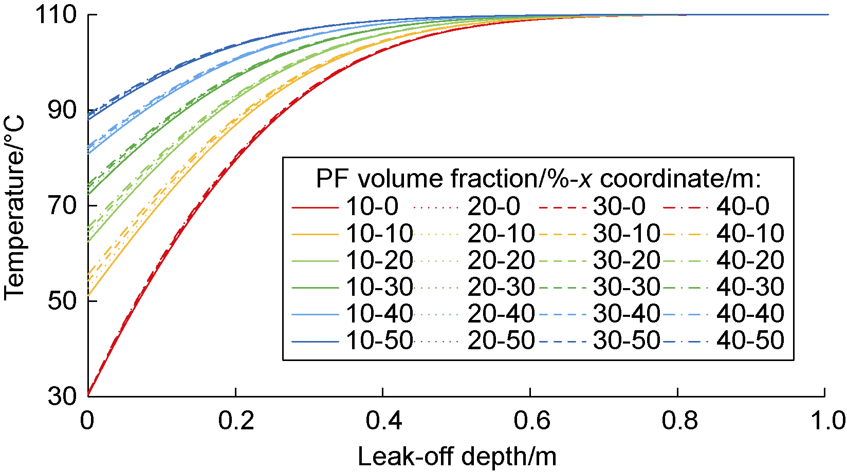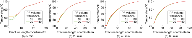 Fig. 7a). (2) At an injection time of 20 min, the temperature at the fracture mouth is lower, and the temperature gradually increases along the fracture length. The temperature at the mouth is below the critical phase-transition temperature of PF, resulting in a lower phase transition rate and limited temperature increase at the mouth. However, at approximately 7 m within the fracture, the temperature rises to the critical value for substantial PF phase transition, causing a significant temperature increase due to the release of phase-transition heat. Beyond 7 m, the remaining PF and phase-transition volume decrease, leading to a reduced temperature variation caused by phase-transition heat (