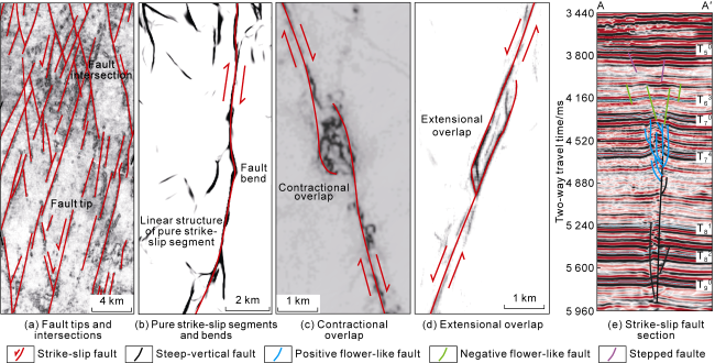 [30-31]. The pure strike-slip segments are characterized by linear extension along the major fault, accompanied by short branch faults in the surrounding areas, forming diverse structural patterns such as linear, en-echelon and pinnate structures