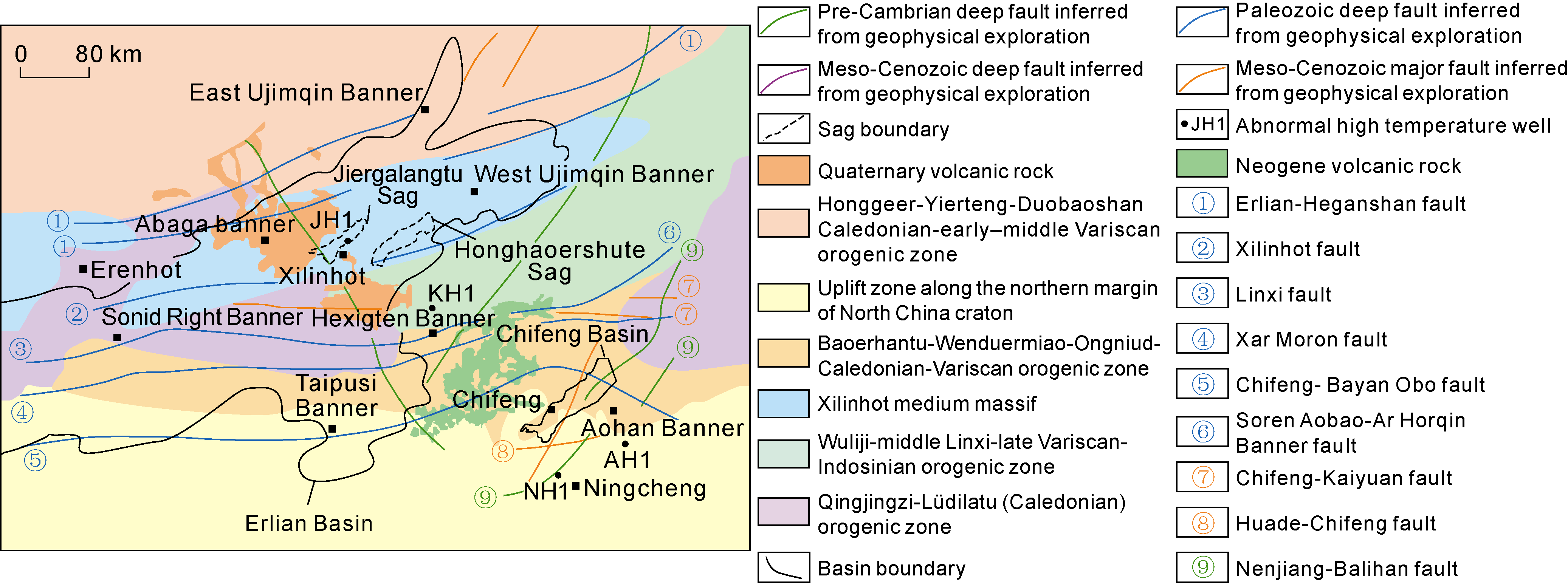 | Jiergalangtu Sag | Abaga volcano group and Dalinor volcano group | Presence of deep molten mass or magma chamber at the depth of 7-9 km | Quaternary | 80-100 | Presence of volcanoes and hot springs | Erlian-Hegenshan fault zone and Xilinhot fault zone directly communicate with molten mass or magma chamber | 4-5 | 1 400-2 100 m thick; mainly mudstone, sandstone and clay | 9.10 | |