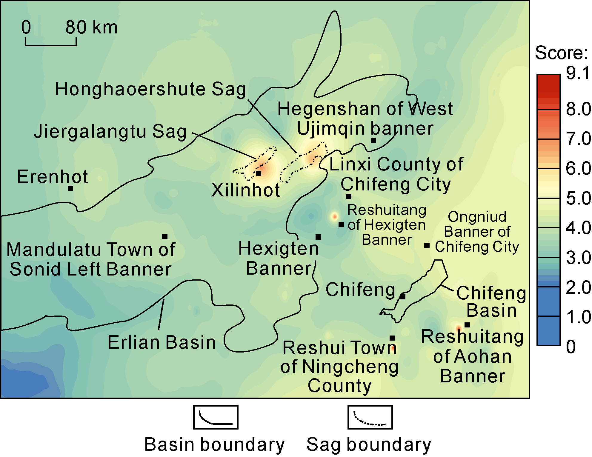 Fig. 5. Evaluation results of HDR prospects in Erlian Basin and its periphery. |