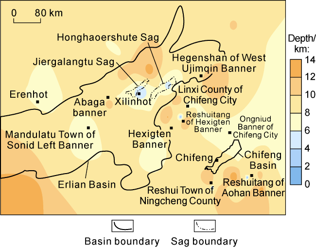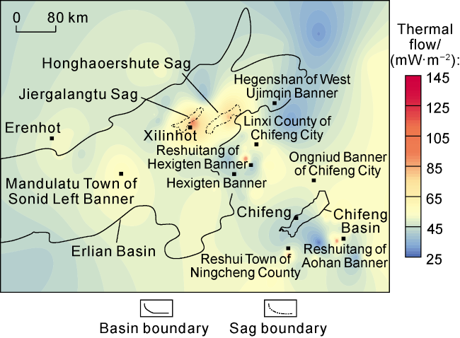 | Honghaoershute Sag | Abaga volcano group and Dalinor volcano group | Presence of deep molten mass or magma chamber at the depth of 7-9 km | Quaternary | 80-90 | Presence of volcanoes and hot springs | Erlian-Hegenshan fault zone and Xilinhot fault zone directly communicate with molten mass or magma chamber | 4-5 | 1 500-2 500 m thick; mainly mudstone, sandstone and clay | 8.45 | |