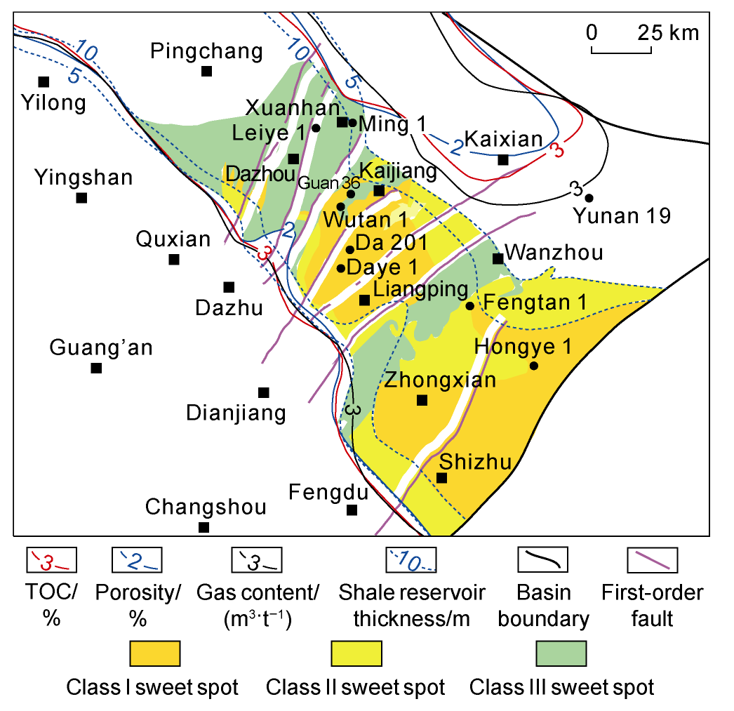 Fig. 10. Distribution of favorable shale gas areas in the Permian Dalong Formation, northern Sichuan Basin. |