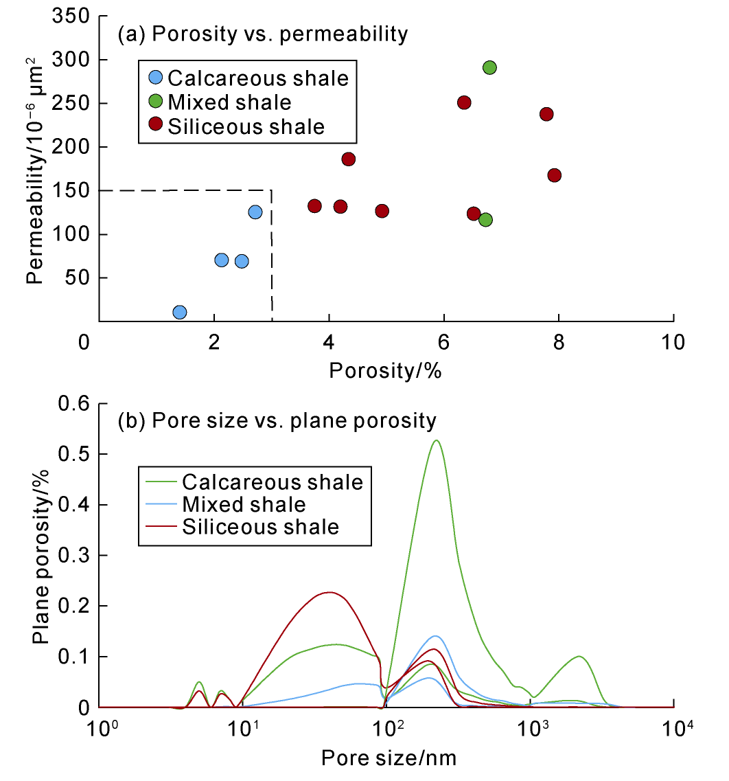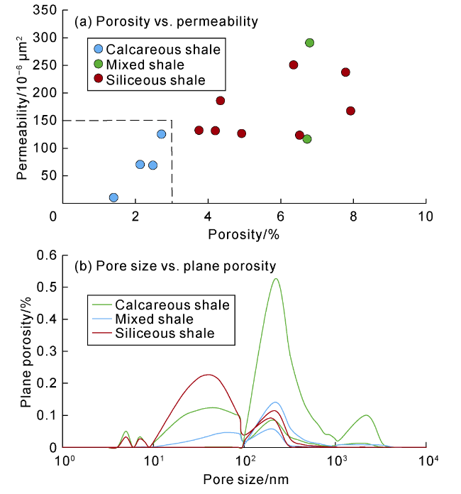 Fig. 7. Porosity, permeability, and pore size vs. plane porosity of lithofacies in the Da 1 Member shale from Well Da 201. |