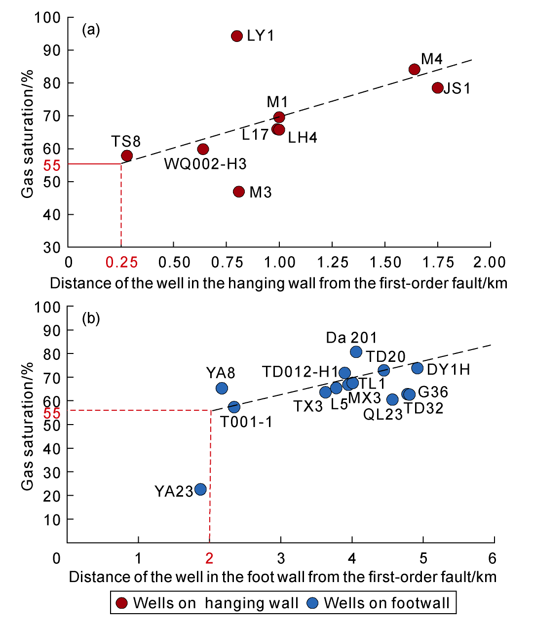 Fig. 8. Relationship between gas saturation and distance from the first-order fault for actual wells. |