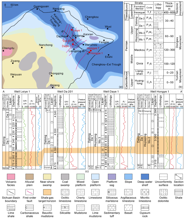 Fig. 1. Distribution of two troughs in the Sichuan Basin and target horizons of shale gas wells in different zones. (a) Sedimentary facies distribution in Dalong Formation of the northern Sichuan Basin; (b) Composite stratigraphic column in the northern Sichuan Basin; (c) Section across Well Leiye 1-Well Da 201-Well Daye 1-Well Hongye 1. GR—natural gamma ray; Rt—resistivity. |