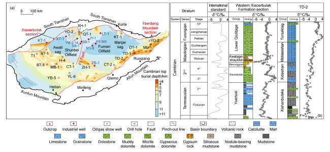 Fig. 4. Core and thin section characteristics of Da 1 Member shale in Well Da 201. (a) Layer ①, Da 1 Member, 4 575.90 m, intact ammonite fossils on core cross-section. (b) Layer ①, Da 1 Member, 4 575.98 m, bioturbated wackestone with brachiopod and echinoid fragments. (c) Layer ②, Da 1 Member, 4 571.10-4 571.19 m, thin limestone developed at the top. (d) Layer ②, Da 1 Member, 4 572.79 m, bioturbated packstone with radiolarian fossils. (e) Layer ③, Da 1 Member, 4 570.47- 4 570.65 m, tuff bands at the bottom, in gradual contact with the underlying marlstone at the top of Layer ②. (f) Layer ③, Da 1 Member, 4 569.42 m, bioturbated carbonaceous-calcareous-siliceous shale with thin-shelled caprinid and radiolarian fossils. (g) Layer ④, Da 1 Member, 4 568.53-4 568.71 m, grayish-black siliceous shale, with tuff and pyrite bands. (h) Layer ④, Da 1 Member, 4 567.83 m, calcareous-carbonaceous shale with shelly fossils. (i) Layer ④, Da 1 Member, 4 668.24-4 568.39 m, grayish-black siliceous shale. (j) Layer ④, Da 1 Member, 4 567.64 m, horizontal laminated carbonaceous shale. (k) Layer ⑤, Da 1 Member, 4 563.23-4 563.41 m, siliceous shale with tuff bands. (l) Layer ⑤, Da 1 Member, 4 565.11 m, siliceous shale. (m) Layer ⑥, Da 1 Member, 4 560.35-4 560.50 m, siliceous shale with calcareous biolaminae. (n) Layer ⑥, Da 1 Member, 4 557.91 m, horizontal laminated carbonaceous shale with caprinid and radiolarian fossils in the lower part. (o) Layer ⑦, Da 1 Member, 4 552.48-4 552.66 m, grayish-black lime shale. (p) Layer ⑦, Da 1 Member, 4 548.50 m, carbonaceous-calcareous- siliceous shale with caprinid-radiolarian in the upper part. |