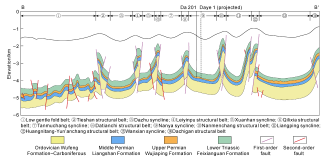 Fig. 2. Geological section derived from the seismic interpretation of Ordovician Wufeng Formation to Lower Triassic Feixianguan Formation in the northern Sichuan Basin (section location shown in |