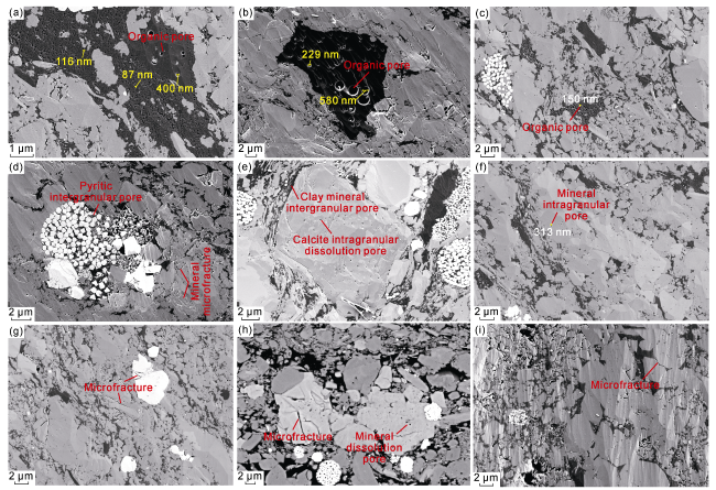 Fig. 5. Thin section images of shale cores from layers in the Da 1 Member in Well Da 201 Well. (a) Layer ④, Da 1 Member, 4 337.65 m, organic pores in shale. (b) Layer ④, Da 1 Member, 4 337.65 m, organic pores in shale (c) Layer ④, Da 1 Member, 4 371.64 m, organic pores in shale. (d) Layer ④, Da 1 Member, 4 335.10 m, pyritic moldic pores and clay mineral intergranular pores. (e) Layer ⑤, Da 1 Member, 4 333.20 m, calcite intragranular dissolution pores. (f) Layer ④, Da 1 Member, 4571.64 m, mineral intragranular pores. (g) Da 1 Member, Layer ④, 4 571.64 m, mineral intergranular fractures. (h) Da 1 Member, Layer ⑤, 4 333.57 m, microgranular calcite and albite dissolution pores and microfractures. (i) Layer ③, Da 1 Member, 4 573.42 m, mineral intergranular fractures. |