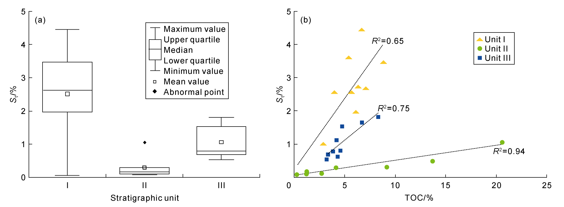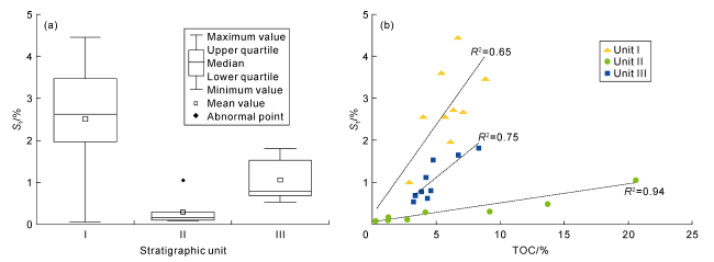 Fig. 10. Distribution of St in whole-rock samples (a) and correlation between St and TOC (b). |