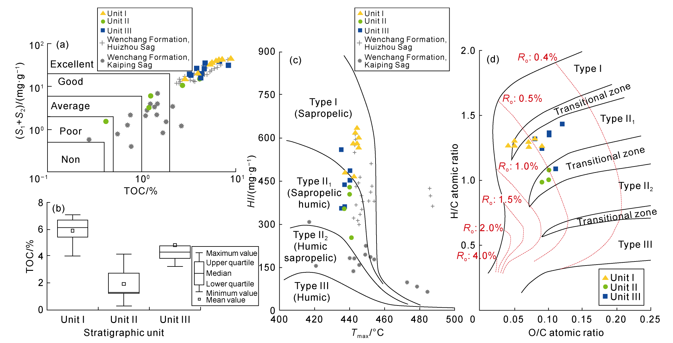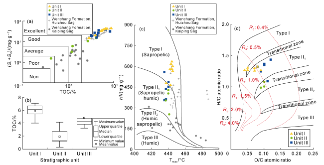 Fig. 3. Geochemical characteristics analysis of source rocks in the Wen 2 Member. (a) TOC-(S1+S2) crossplot; (b) TOC classification; (c) Tmax-HI cross-plot; (d) Kerogen elemental analysis. |