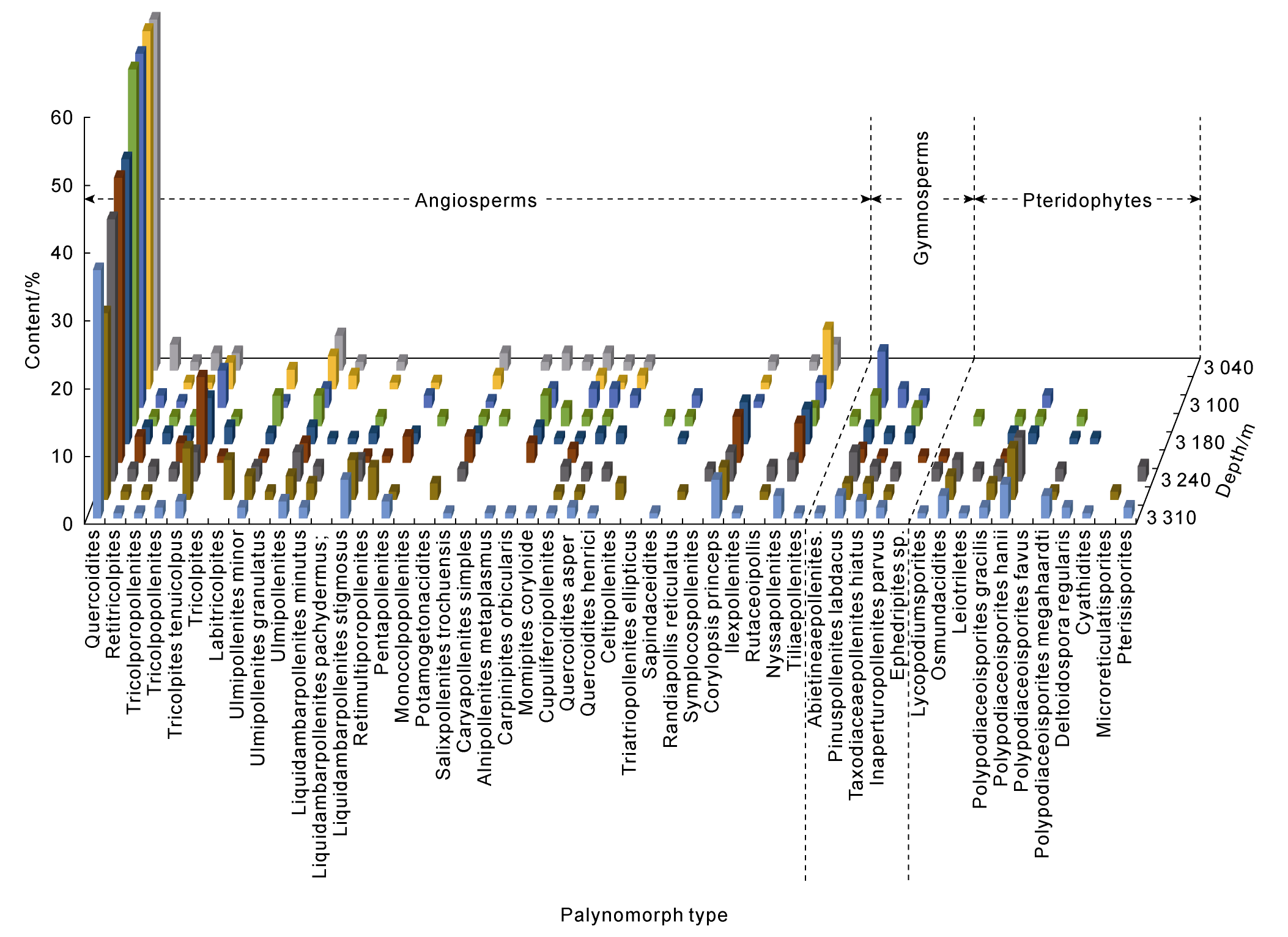 Fig. 4. Palynomorph types and contents in the Wen 2 Member (color corresponds to depth). |