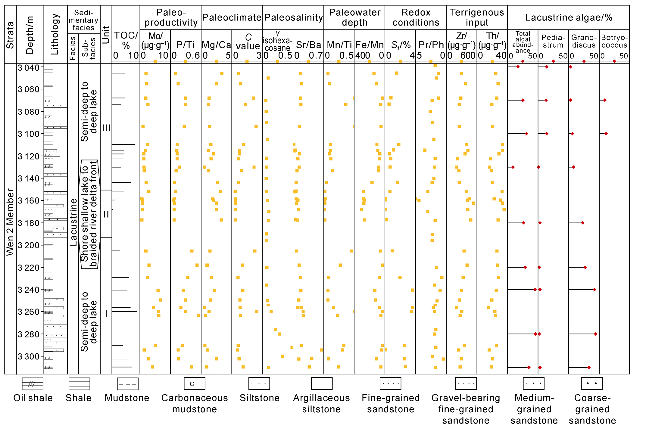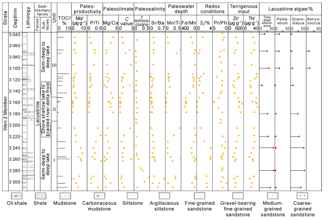 Fig. 5. Comprehensive geochemical column of the Wen 2 Member in Well W1. |