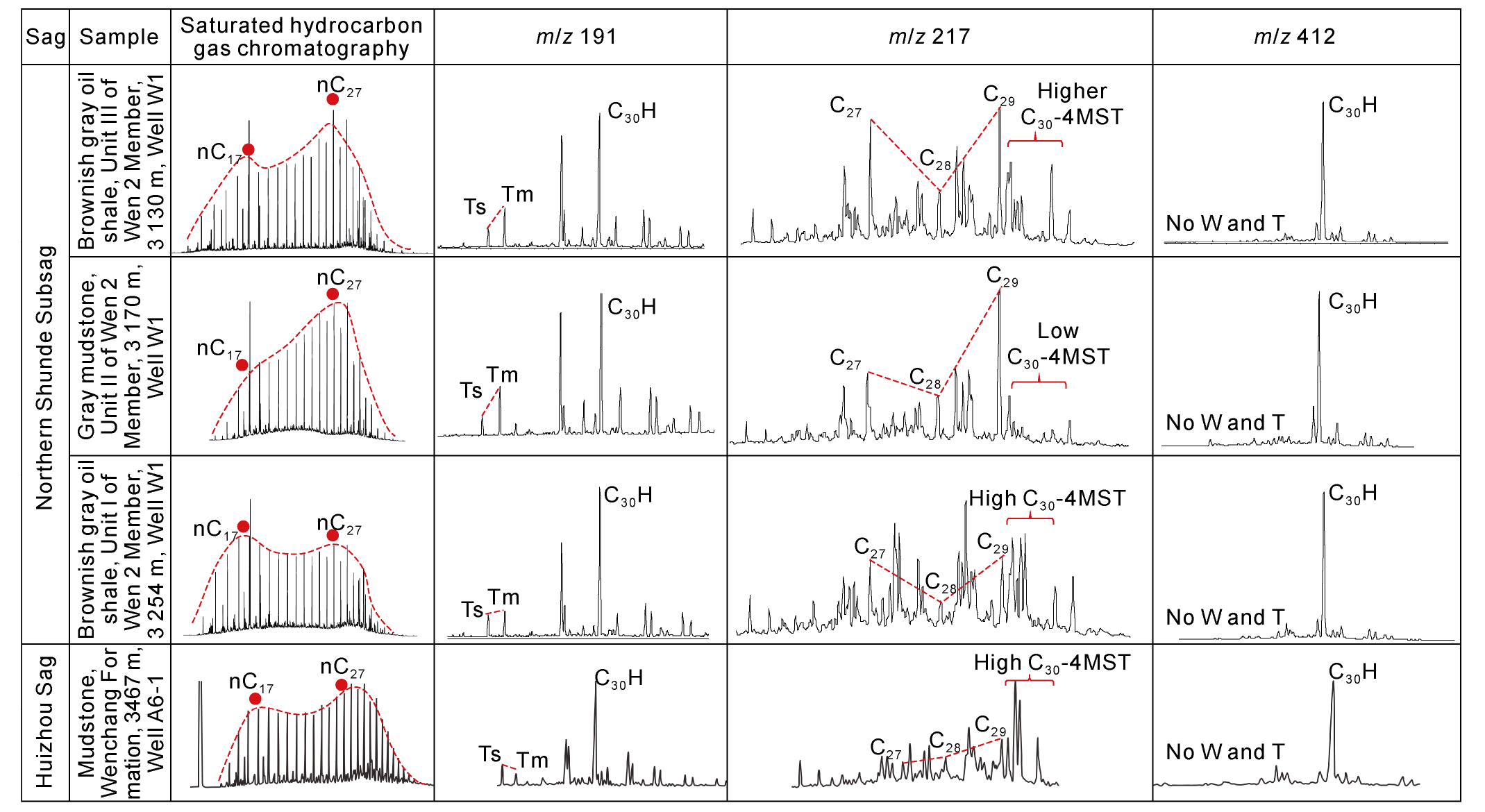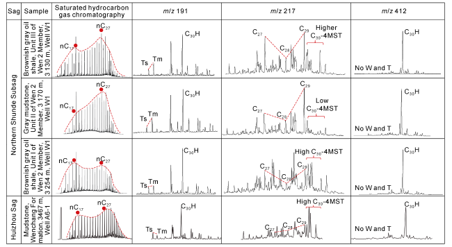 Fig. 6. Typical n-alkane and biomarker compound distribution of hydrocarbon source rocks in the Wen 2 Member of the Northern Shunde Subsag and the Wenchang Formation of the Huizhou Sag. |