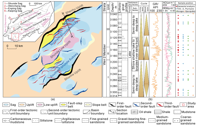 Fig. 1. Regional location and structural outline of Shunde sag in Pearl River Mouth Basin (a), comprehensive histogram of the second member of Wenchang Formation (b) (St—total sulfur content). |