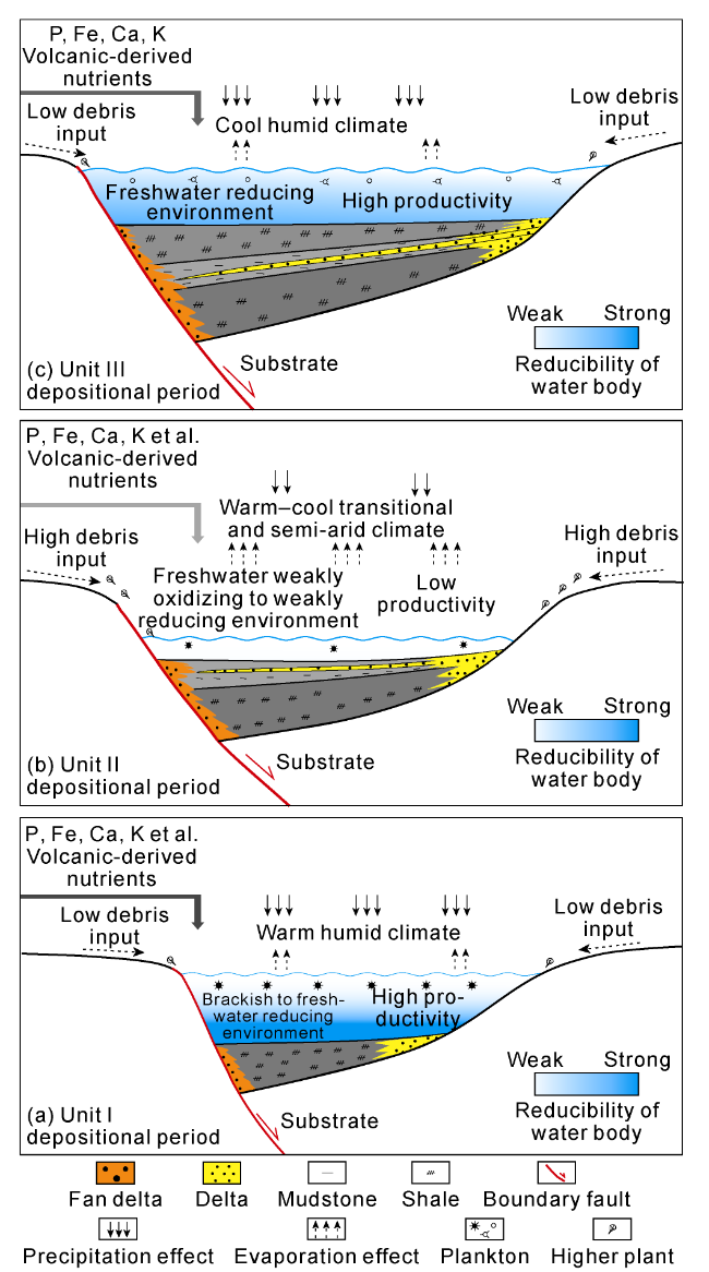 Fig. 12. Development model of excellent source rocks in the Wen 2 Member of the Shunde Sag (colors changing from light grey to deep grey represents organic matter content changing from low to high). |