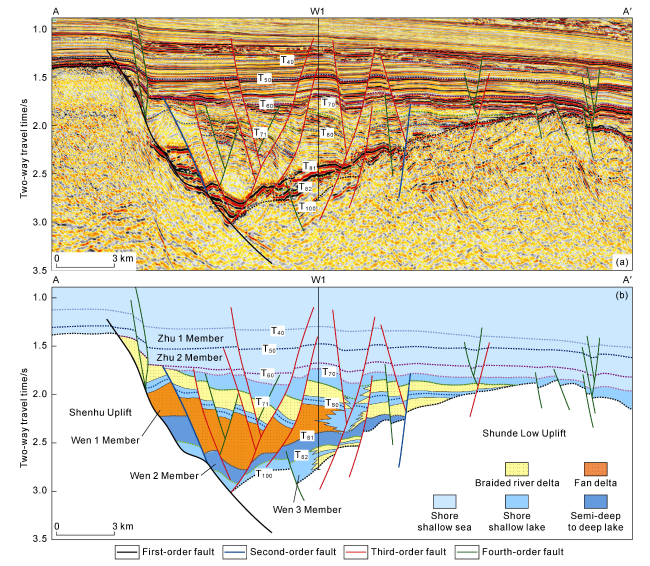 Fig. 2. Typical well-tie seismic section (a) and sequence stratigraphic interpretation section (b) of the Northern Shunde Subsag in the Pearl River Mouth Basin (section location shown in |