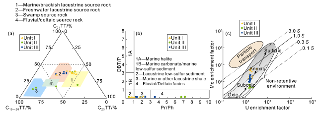Fig. 8. Discrimination diagram for depositional environments of source rocks in the Wen 2 Member (S represents the Mo/U ratio in seawater). |