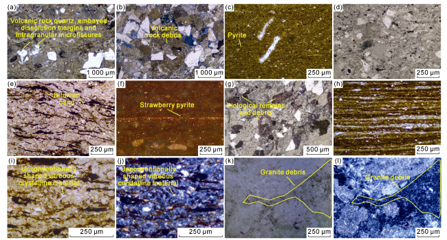 Fig. 9. Thin-section characteristics of clastic rocks in the Wen 2 Member of Well W1, Wenchang Formation. (a) 3 023.0 m, tuffaceous texture with volcanic dust cements, irregularly shaped quartz grains derived from volcanic rocks, displaying embayed dissolution margins and intragranular microfissures (plane-polarized light). (b) 3 033.4 m, tuffaceous sandstone containing volcanic debris, predominantly with coarse debris grains, and extremely coarse grains occassionally (plane-polarized light). (c) 3 122.6 m, mudstone composed mainly of mud mixed with minor silt, exhibiting lepidoblastic texture and sparse pyrite (plane-polarized light). (d) 3 156.5 m, tuffaceous texture dominated by debris with minor crystal fragments, cemented by mud (plane-polarized light). (e) 3 177.5 m, tuffaceous texture with bitumen-like bands filling fractures, containing abundant irregularly shaped volcanic materials (plane-polarized light). (f) 3 256.5 m, oil shale interbedded with clay layers or lenticular clay laminae, strawberry pyrite distributed along bedding planes (plane-polarized light). (g) 3 288.0 m, tuffaceous texture containing bioclasts and minor crystal fragments (plane-polarized light). (h) 3 309.6 m, alternating thin layers of oil shale and claystone. (i) 3 177.5 m, unconventionally shaped vitreous crystalline material (plane-polarized light). (j) 3 177.5 m, unconventionally shaped vitreous crystalline material (cross-polarized light). (k) 3 023.0 m, granitic lithic fragment with tuffaceous cement in intergranular spaces (cross-polarized light). (l) 3 023.0 m, same field of view as Fig. k (plane-polarized light). |