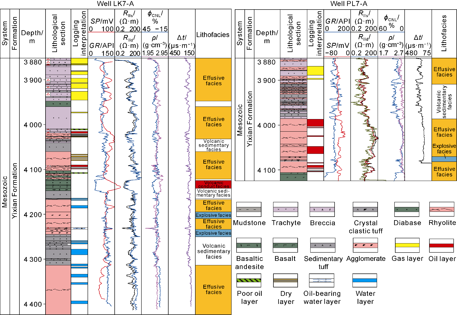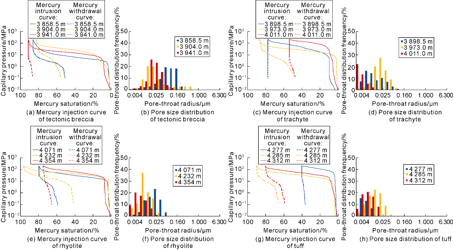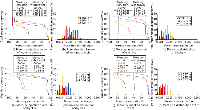 Sidewall coring, cast thin sections and scanning electron microscopy (SEM) reveal significant differences in reservoir space types among different lithologies. The main reservoir spaces in tectonic breccia are secondary pores and fractures, including matrix dissolution pores, intergranular dissolution pores, weathering fractures, tectonic fractures and dissolution-enlarged fractures (