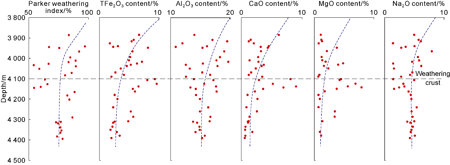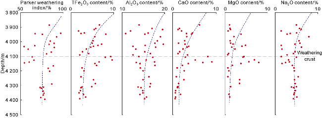 Fig. 3b) are irregular fractures formed by weathering of volcanic rocks exposed at the surface, most developed near the weathering crust on the top of volcanic rocks, commonly presenting horsetail-like, en echelon-like, and leaf vein-like patterns. Weathering fractures intersect with tectonic fractures, dividing the rocks into blocks of varying sizes, which facilitates dissolution. Zeolites, argillaceous materials and carbonate minerals are commonly found to fill weathering fractures. Tectonic fractures (