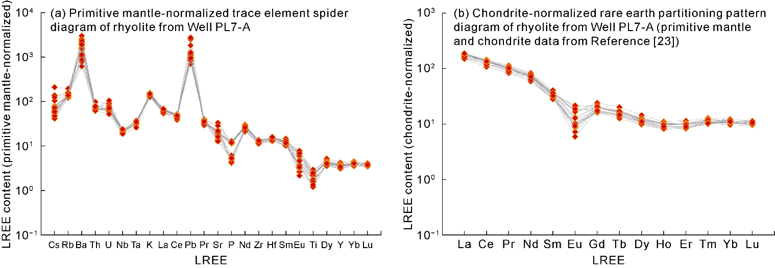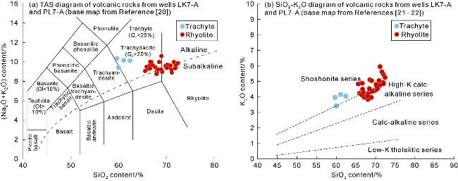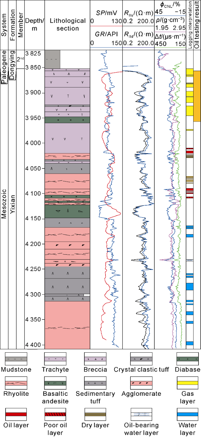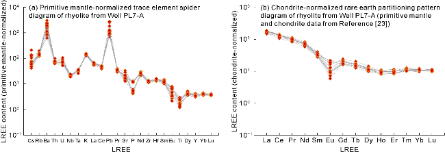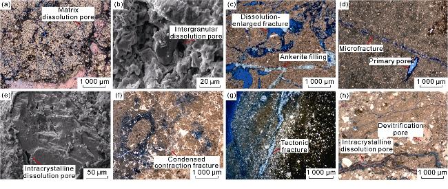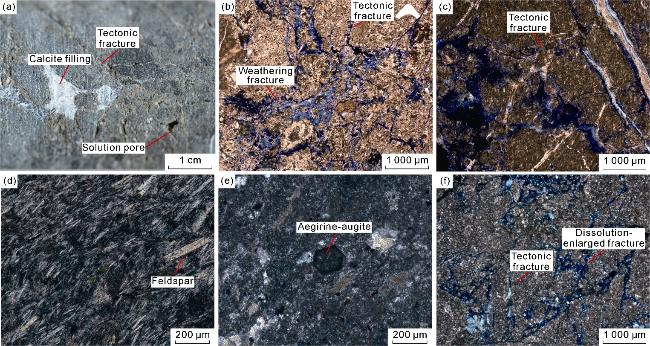 Fig. 9c) are formed by the secondary dissolution of feldspar, calcite, and ankerite filling in early tectonic fractures, resulting in widened fractures. The widths of the dissolution fractures vary, and they are most developed near the top weathering and dissolution zone. The main reservoir spaces in trachyte and rhyolite include primary pores, secondary pores and fractures, such as primary gas pores (
