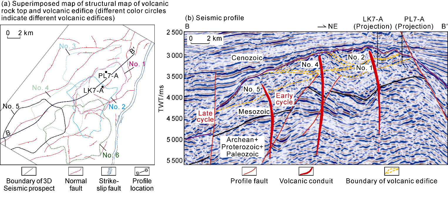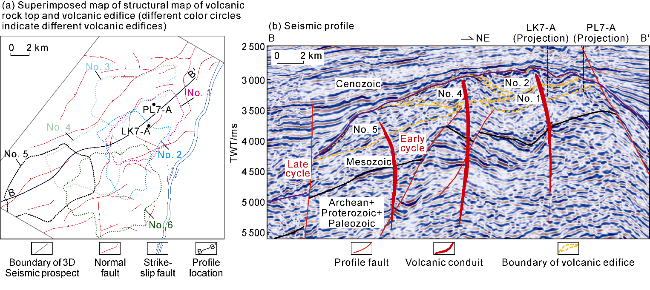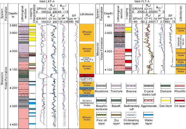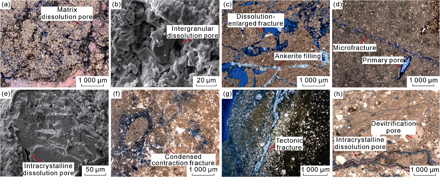 Fig. 9f) and tectonic fractures. Due to the low volatile content in magma, primary pores account for a small proportion, mainly as elongated primary gas pores. Condensed contraction fractures are formed during the ascent of magma to the surface and effusion, when magma contacts with relatively low-temperature surrounding rocks, air, or water and cools rapidly. During solidification, the cooling magma undergoes quenching and rapid contraction, generating tensile stress that forms fractures. The condensed contraction fractures are abundant in lava with large extension scale but small aperture and they are formed early with high overall filling degree, commonly filled or semi-filled by chlorite, calcite, or quartz. Tuff generally has poorly developed reservoir spaces, dominated by secondary pores and fractures, such as intra-crystalline dissolution pores, devitrification pores (