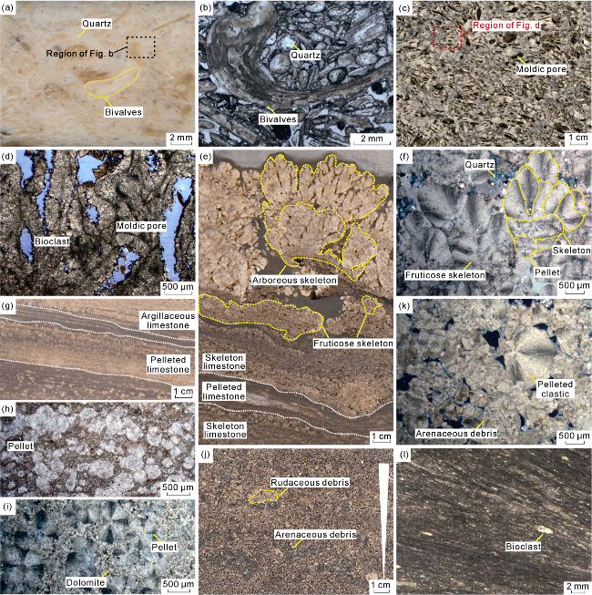 Fig. 4. Core and microscopic petrological characteristics of the Lower Cretaceous SQ1-SQ3 sequences in M block of the Santos Basin. (a) Well M5, 5 532.00 m, ITP Formation, shell limestone, intergranular siliceous cementation, wellbore coring; (b) Well M5, 5 532.00 m, ITP Formation, shell limestone, micrite envelopes, part of the shells are metasomized by siliceous matter, single polarized light, thin section; (c) Well M5, 5 340.05 m, ITP Formation, shell limestone, with moldic pores and intergranular dissolution pores, core; (d) Well M5, 5 340.05m, ITP Formation, shell limestone, bioclastic recrystallization, with intergranular dissolution pores and moldic pores, blue casts, single polarized light, thin section; (e) Well M12, 5 483.40 m, BVE200 Member, with interbedded shrub skeleton limestone and pelleted limestone at the bottom, biological skeletons grow upwards, developing fruticose skeletons, cores; (f) Well M31, 5 523.60 m, BVE300 Member, fruticose skeleton limestone, with elliptical pellets growing upward to form skeletons, orthogonal light, thin section; (g) Well M12, 5 575.80 m, BVE300 Member, with rhythmic interlayer of pelleted limestone and lamellar argillaceous limestone, core; (h) Well M31, 5450.45 m, BVE100 Member, pelleted limestone, intergranular filling of argillaceous permeable silts, single polarized light, thin section; (i) Well M12, 5 575.80 m, BVE300 Member, pelleted limestone, intergranular filling of dolomite grains and a small amount of insoluble residue, orthogonal light, thin section; (j) Well M12, 5 474.10 m, BVE200 Member, pebbled arenaceous limestone, with reverse grain sequence characteristics longitudinally, core; (k) Well M12, 5 571.75 m, BVE300 Member, arenaceous limestone, with pelleted fragments, orthogonal light, thin section; (l) Well M31, 5 845.00 m, ITP Formation, lamellar shell micrite, wellbore coring. |