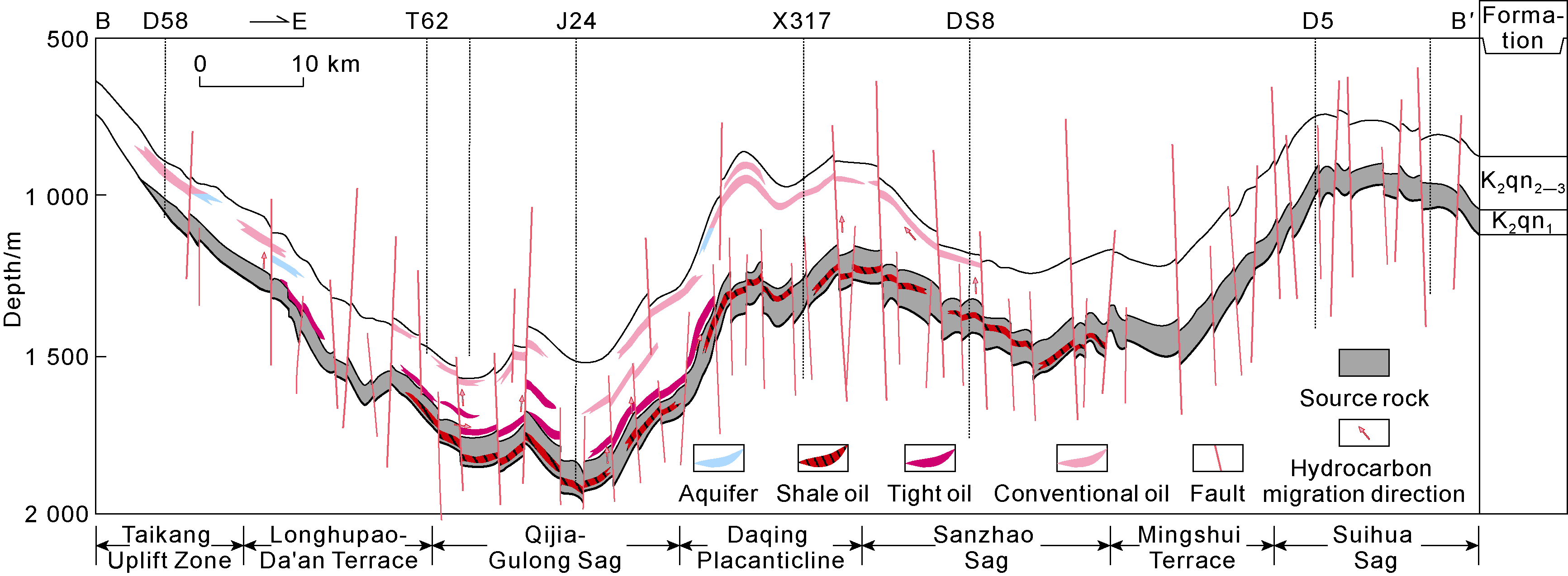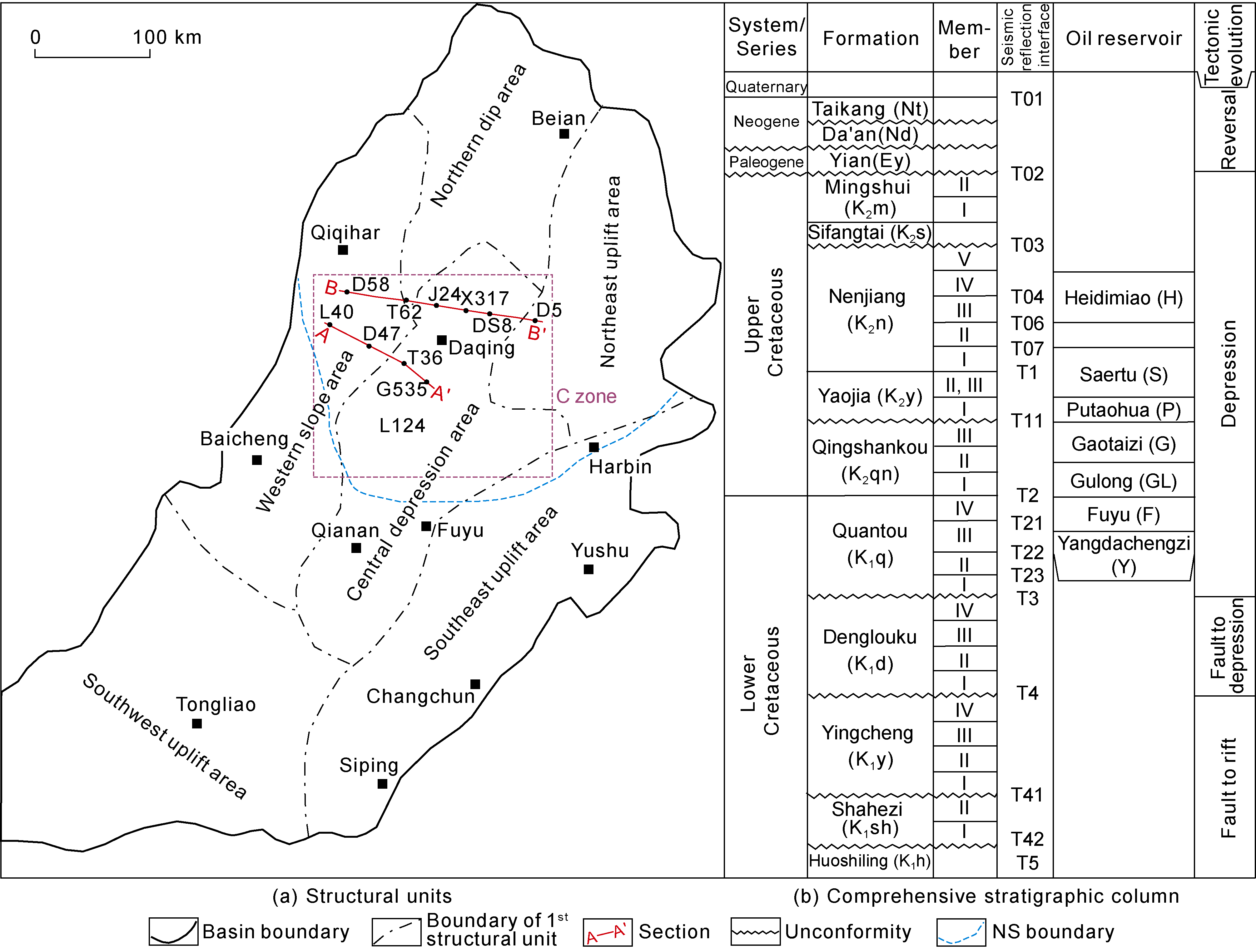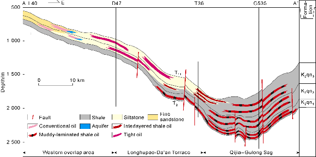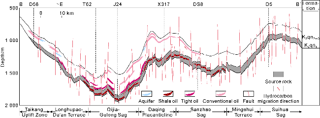 Fig. 6a), and facilitated hydrocarbon migration into the Gaotaizi layer, resulting in extensive tight oil accumulation along with some conventional reservoirs. During the deposition of the Paleogene Yi'an Formation, most faults penetrating the Qingshankou source rocks were close (