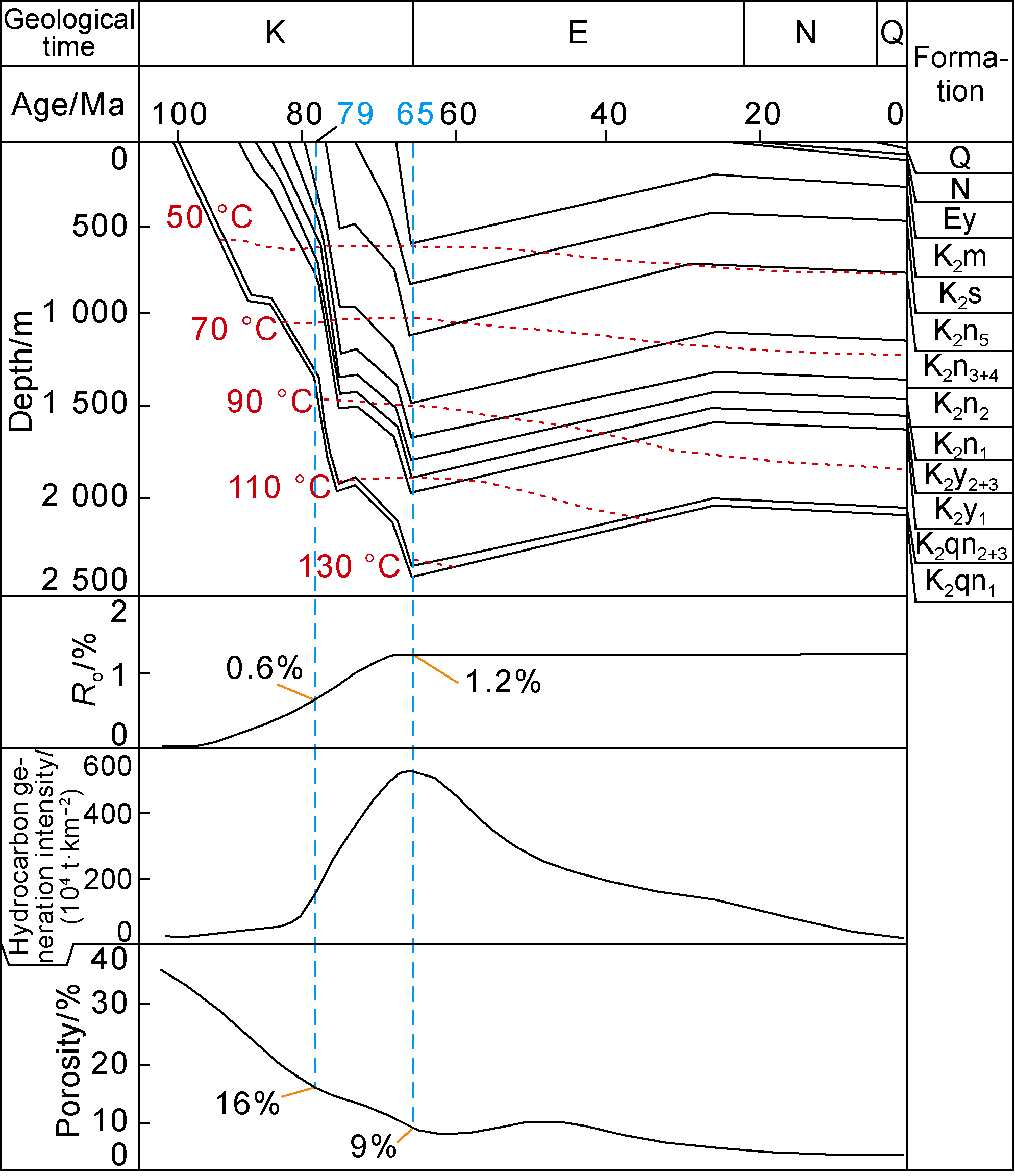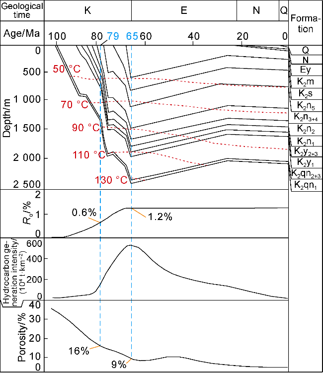 Fig. 5). By the end of the Nenjiang Period, the top of the Qing 1 Member source rock was buried at 900-1 600 m, with vitrinite reflectance (