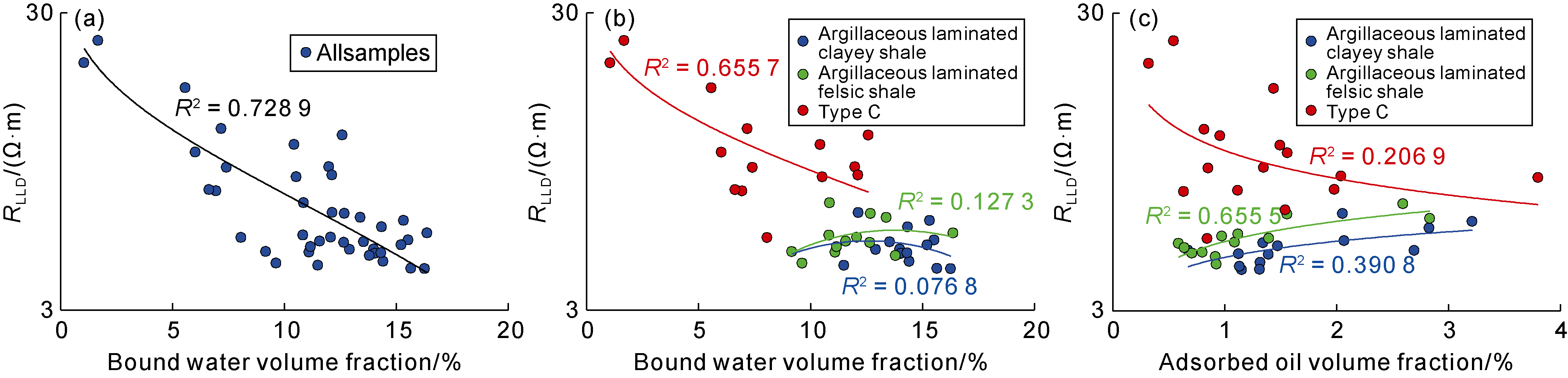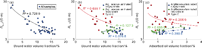 Fig. 5. Correlation between bound water, adsorbed oil volume fraction and resistivity in the K2qn1 shale. |