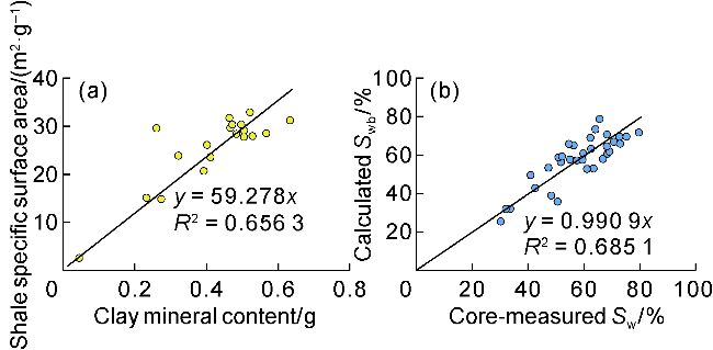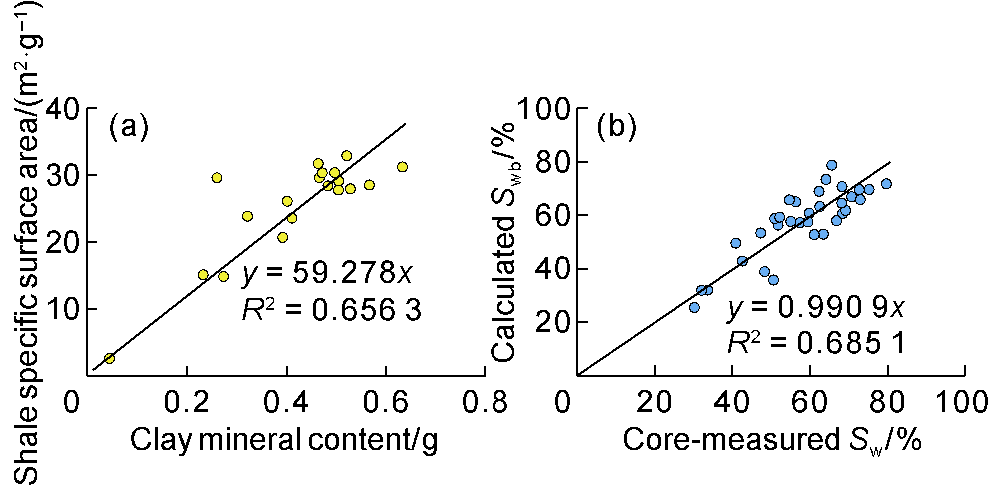 Fig. 7. Correlations between clay content and specific surface area, and between calculated Swb and core-measured Sw. |