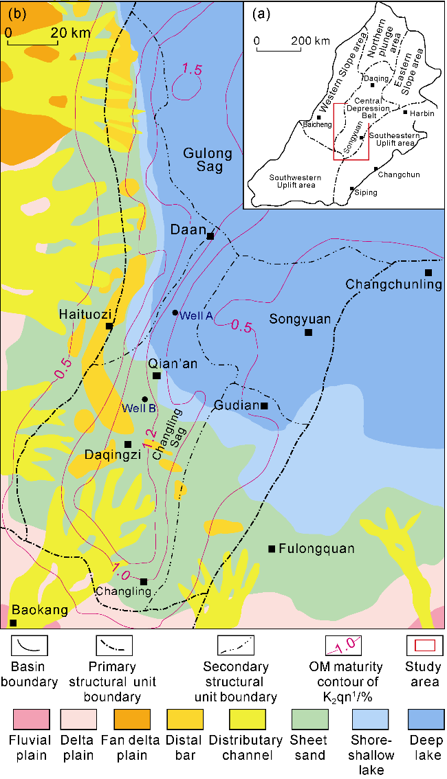 Fig. 1. Structural location of the Changling Sag in the southern Songliao Basin and sedimentary facies of K2qn1. |