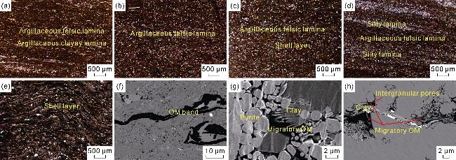 Fig. 3. Microscopic characteristics of lithologies and OM of the K2qn1 shale. (a) Clayey shale, Sample C34, 2 372.98 m; (b) Felsic shale, Sample C50, 2 377.55 m; (c) Calcareous shale, Sample C46, 2 376.40 m; (d) Silty laminated felsic shale, Sample C76, 2 384.50 m; (e) Shell limestone, Sample C22, 2 369.38 m; (f) OM band, calcareous shale, Sample C20, 2 369.38 m; (g) Migratory OM filling intercrystalline pores between pyrite and clay minerals, felsic shale, Sample C38, 2 374.21 m; (h) Migratory OM filling intergranular pores, silty laminated felsic shale, Sample C148, 2 404.16 m. |